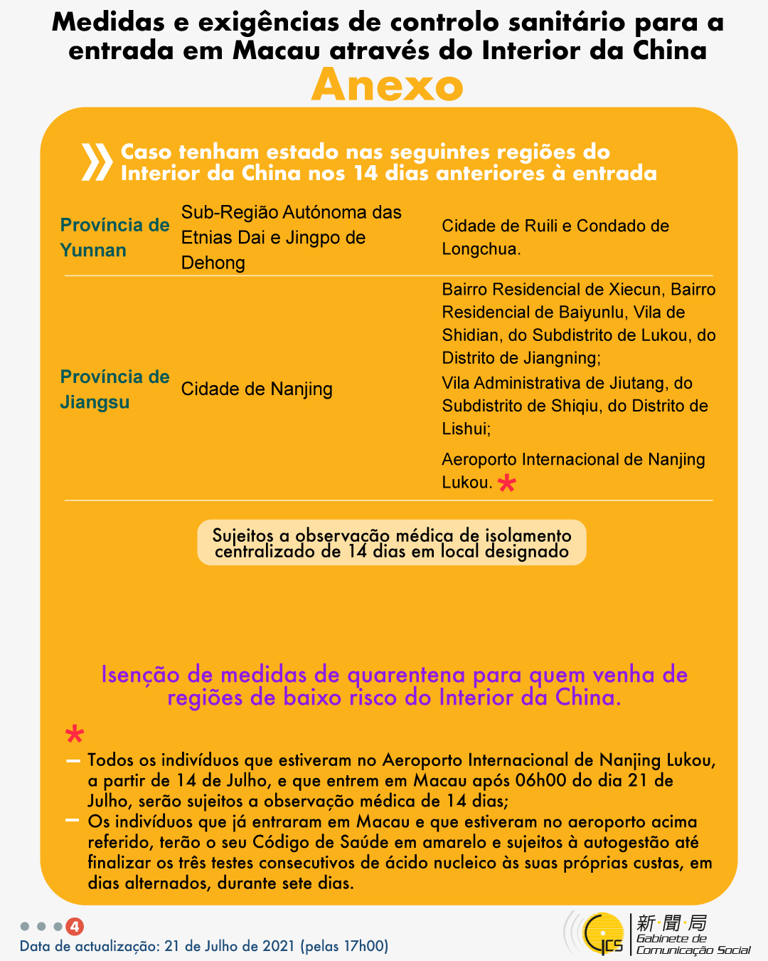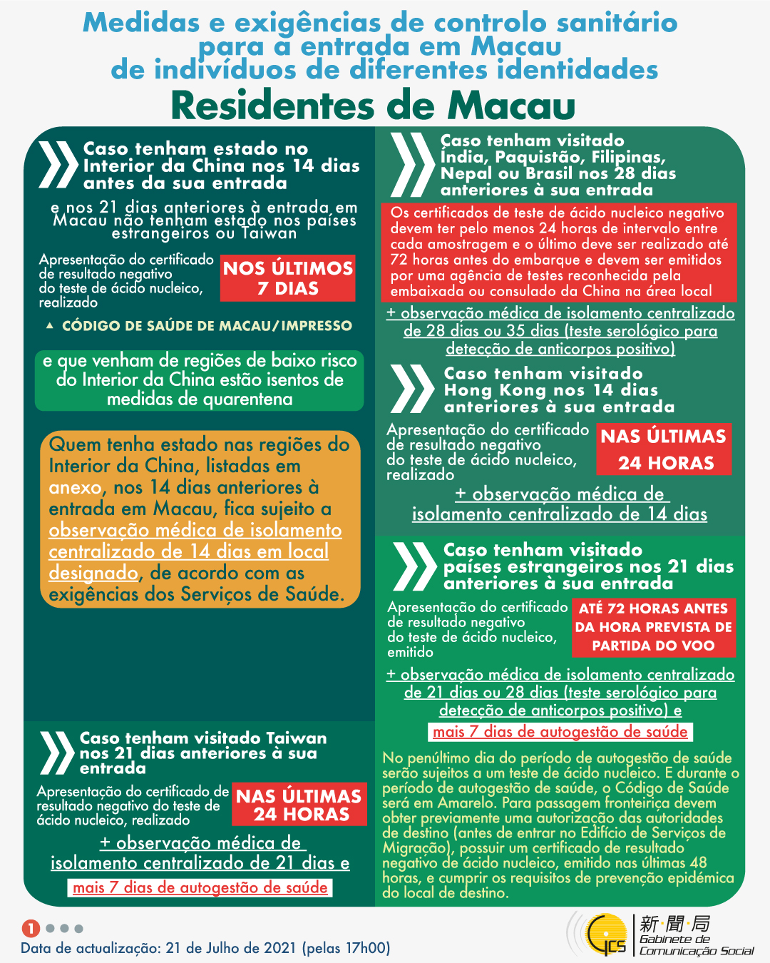 (Infografia)Medidas e exigências de controlo sanitário para a entrada em Macau de indivíduos de diferentes identidades, actualizadas no dia 21 de Julho de 2021