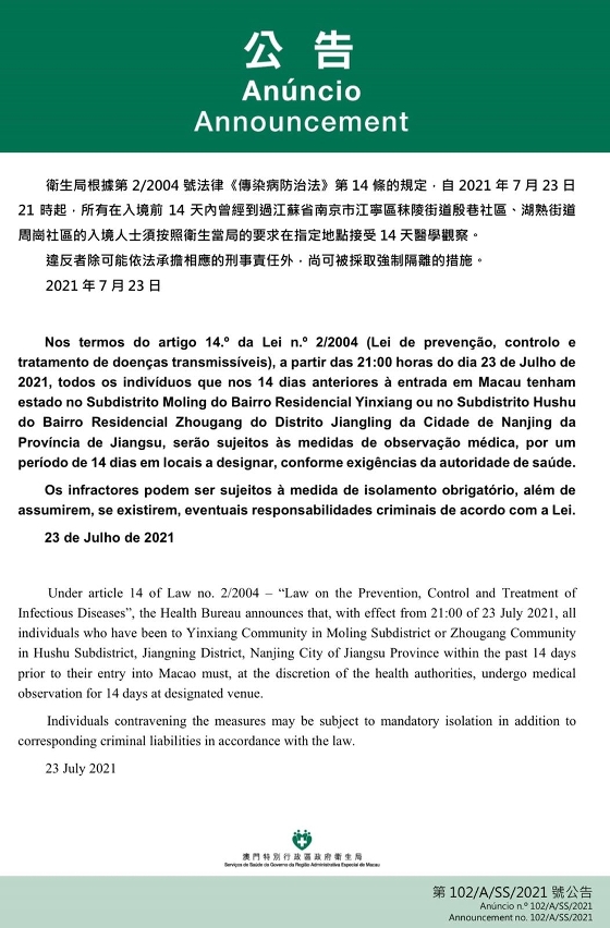 O Centro de Coordenação de Contingência do Novo Tipo de Coronavírus informa que tendo em consideração a evolução epidemiológica mais actualizada da Cidade de Nanjing da Província de Jiangsu, nos termos do artigo 14.º da Lei n.º 2/2004 (Lei de prevenção, controlo e tratamento de doenças transmissíveis), a partir das 21:00 horas do dia 23 de Julho de 2021, todos os indivíduos que nos 14 dias anteriores à entrada em Macau tenham estado no Subdistrito Moling do Bairro Residencial Yinxiang ou no Subdistrito Hushu do Bairro Residencial Zhougang do Distrito Jiangling da Cidade de Nanjing da Província de Jiangsu, serão sujeitos às medidas de observação médica, por um período de 14 dias em locais a designar, conforme exigências da autoridade de saúde.