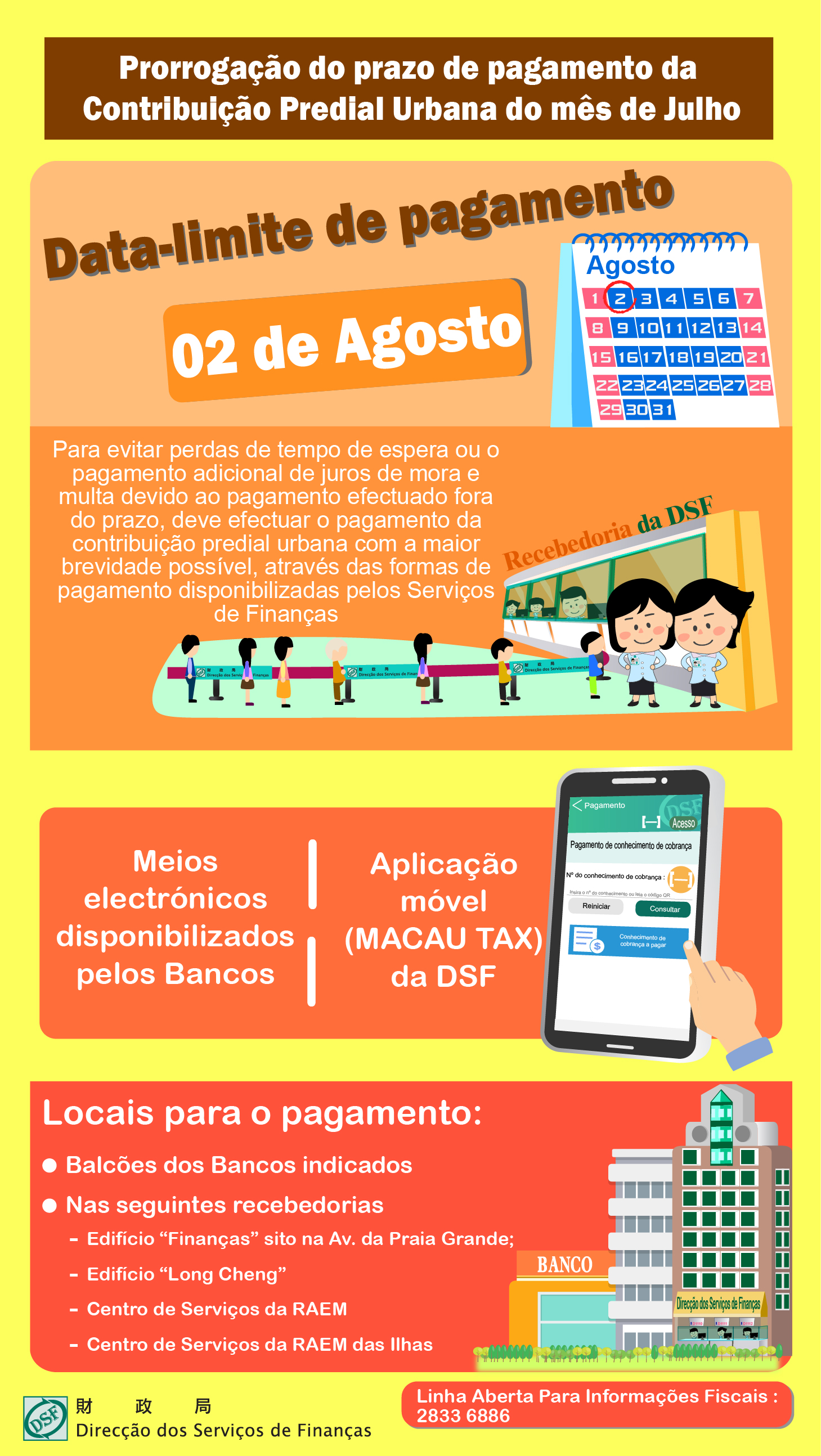 Tendo em consideração que o dia 31 de Julho, p.f., coincide com um sábado, o prazo de pagamento da Contribuição Predial Urbana do mês de Julho, será prorrogado até ao dia 2 de Agosto (segunda-feira). Para evitar perdas de tempo de espera ou o pagamento adicional de juros de mora e multa, devido ao pagamento fora do prazo, esta Direcção de Serviços apela aos contribuintes que ainda não o fizeram para efectuarem o respectivo pagamento com a maior brevidade possível, por meio das formas de pagamento disponibilizadas pelos Serviços de Finanças, podendo ainda fazê-lo dentro das horas de expediente, nos balcões dos Bancos indicados ou por sua transacção electrónica, além disso, utilize a aplicação móvel (MACAU TAX) da DSF para digitalizar o QRcode do conhecimento de cobrança, para ligar-se à plataforma de pagamento móvel, e efectuar o pagamento do imposto ou nas Recebedorias instaladas, respectivamente, no Edifício “Finanças”, no Edifício “Long Cheng”, no Centro de Serviços da RAEM e no Centro de Serviços da RAEM das Ilhas. Por forma a facilitar o pagamento, os contribuintes podem, com a utilização do respectivo Bilhete de Identidade de Residente da RAEM, imprimir nos diversos quiosques os dados sumários do conhecimento de cobrança, a fim de efectuarem o pagamento nas máquinas ATM e através do banco por transacção electrónica, ou, imprimir a 2.ª via do conhecimento de cobrança, apenas disponível nos quiosques da DSF.