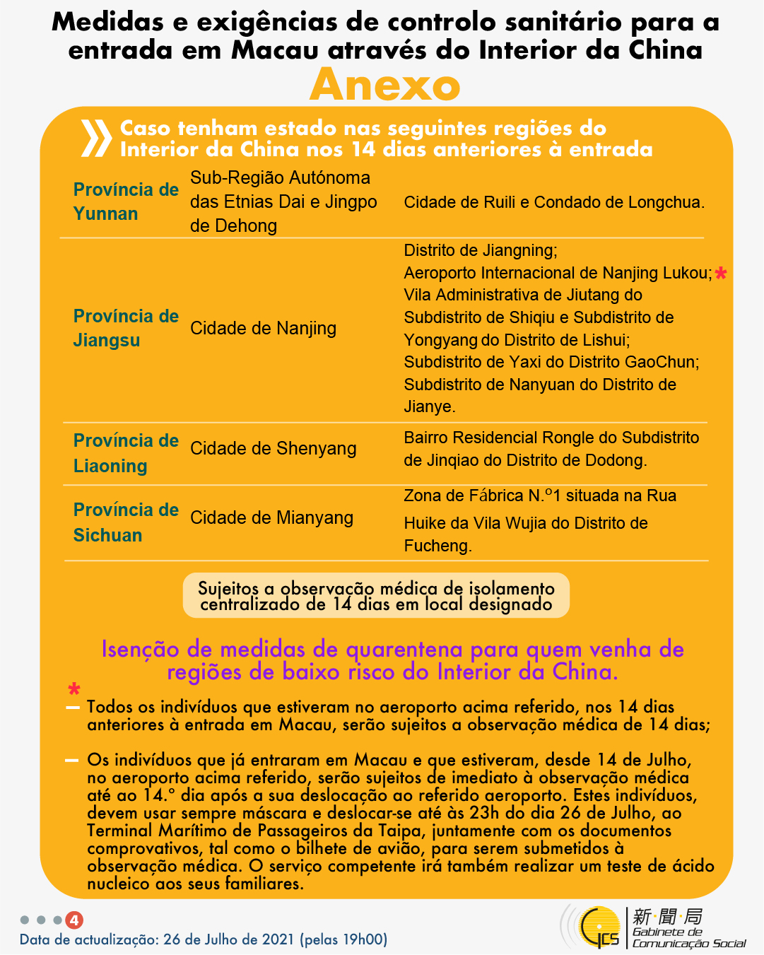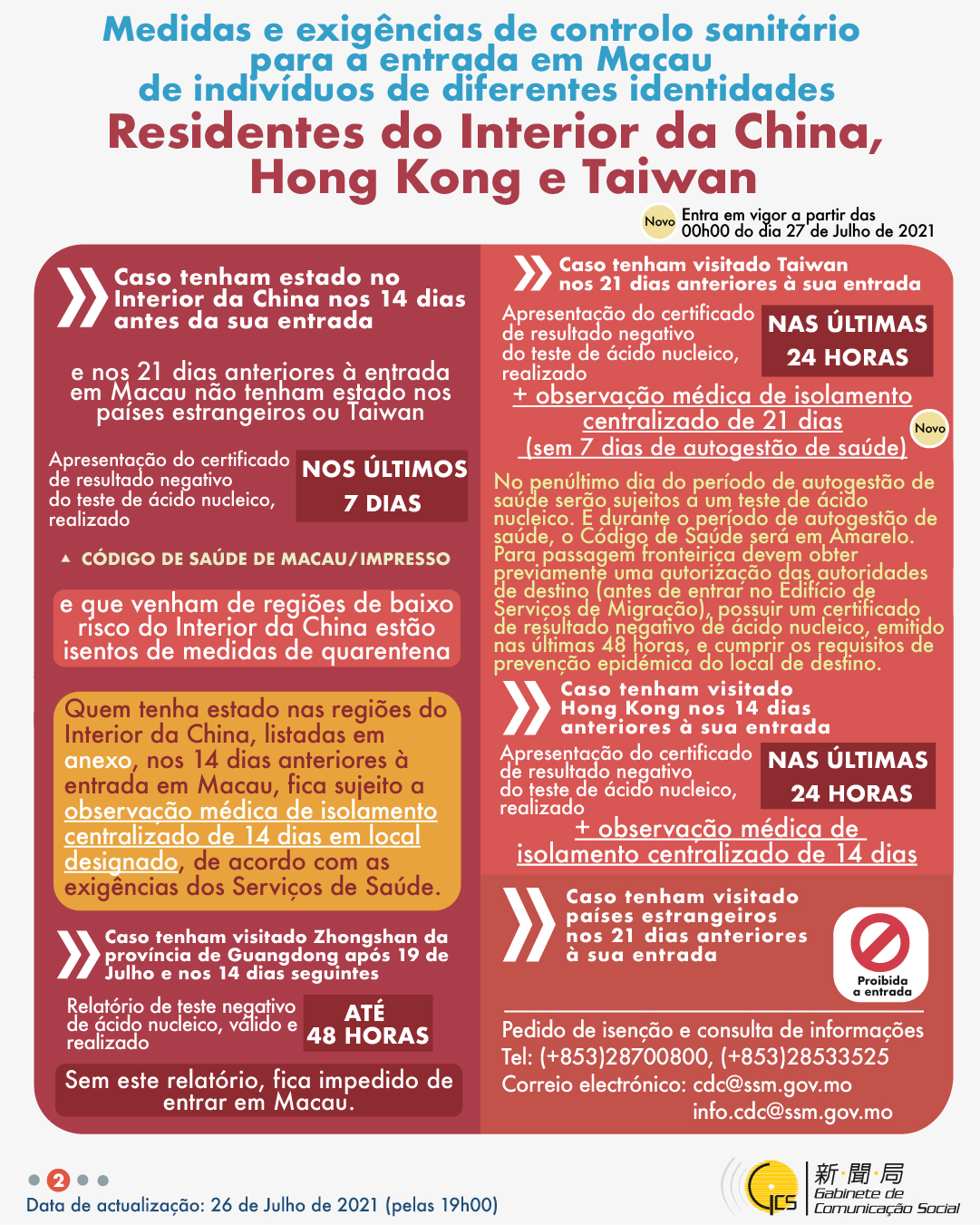 (Infografia)Medidas e exigências de controlo sanitário para a entrada em Macau de indivíduos de diferentes identidades, actualizadas no dia 26 de Julho de 2021
