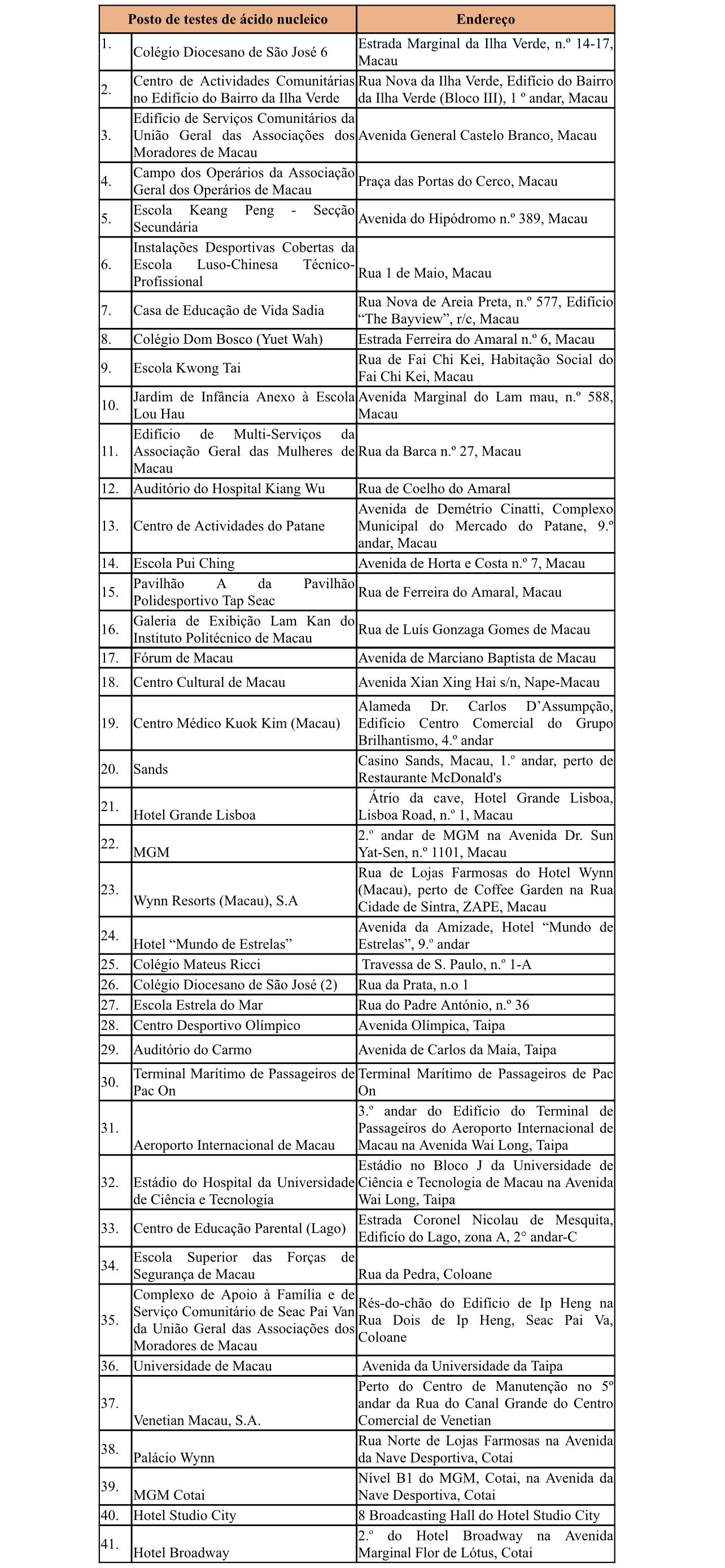 Existem 41 postos de ácido nucleico em Macau, incluindo 27 em Macau e 14 em Cotai. Consulte a tabela abaixo indicada: