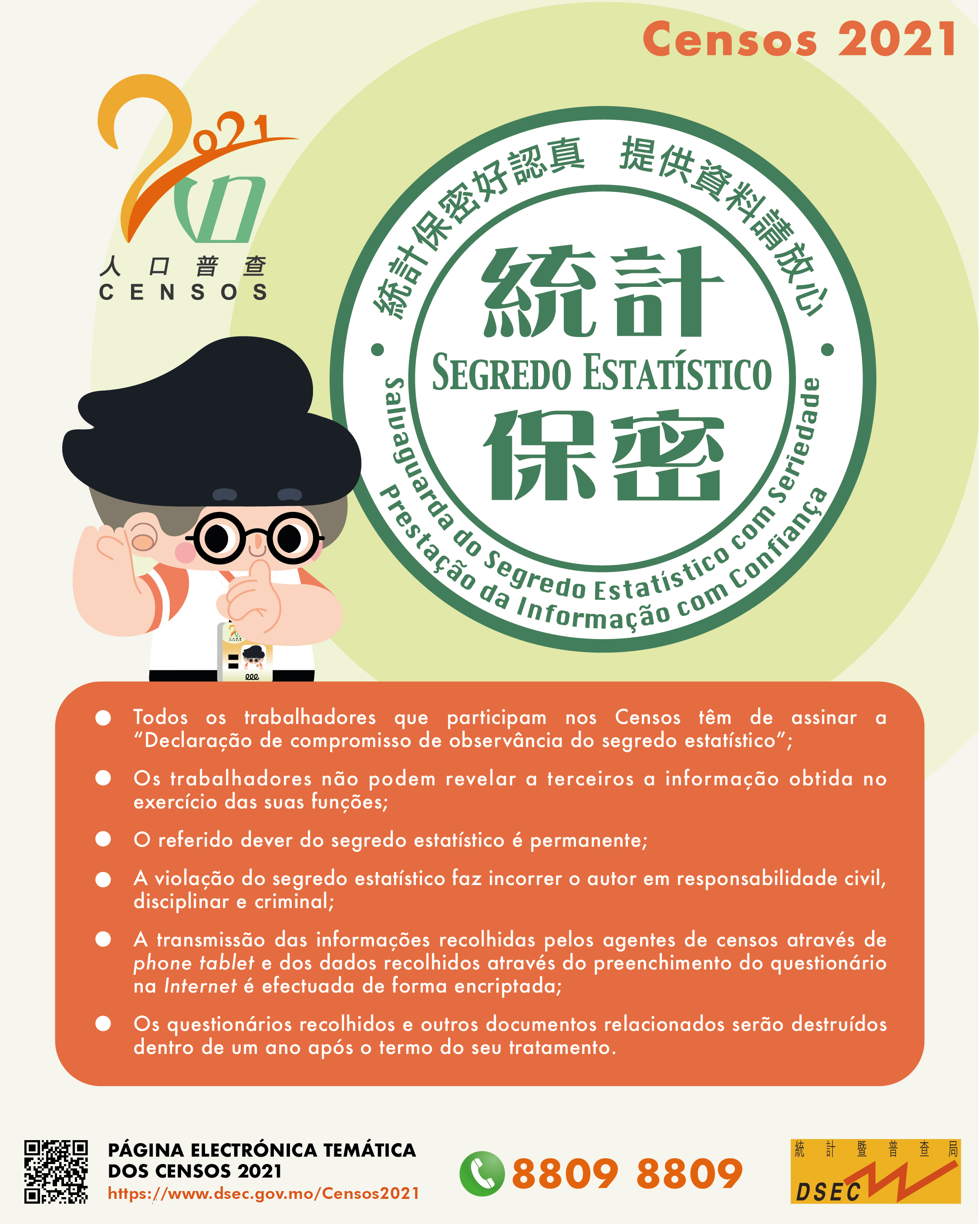 De acordo com o “Regime dos Censos 2021”, publicado no Regulamento Administrativo n.º 6/2021, todos os objectos dos Censos devem fornecer as informações requeridas dentro do prazo estipulado. Além disso, nos termos do Despacho n.º 242/GM/99 “Regulamento de Execução Relativo à Salvaguarda do Segredo Estatístico”, todas as informações recolhidas pela DSEC são rigorosamente confidenciais e são divulgadas apenas de forma global após o processamento agregado dos dados, não sendo jamais revelada qualquer informação pessoal susceptível de identificar qualquer agregado familiar.