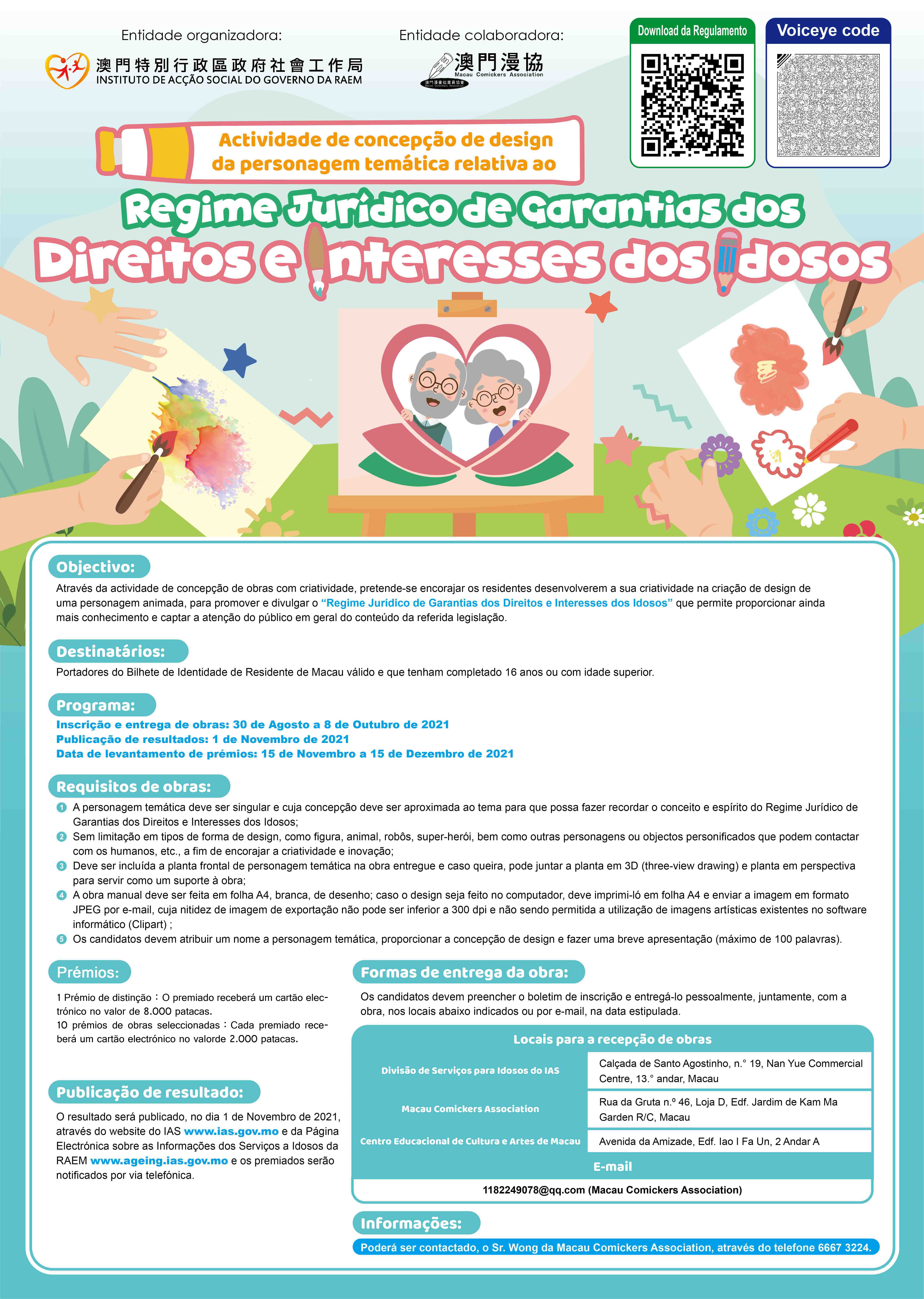 A actividade de concepção de design da personagem temática relativa ao “Regime Jurídico de Garantias dos Direitos e Interesses dos Idosos”, organizada pelo Instituto de Acção Social (IAS) e em colaboração com a Macau Comickers Association, tem o início da inscrição e da entrega de obras no período de 30 de Agosto a 8 de Outubro, sendo bem vinda a participação dos residentes, com idade igual ou superior a 16 anos, no desenvolvimento de criatividade na concepção de design de uma personagem animada que represente o “Regime Jurídico de Garantias dos Direitos e Interesses dos Idosos”, no sentido de promover e divulgar o conteúdo da referida legislação junto da população em geral.