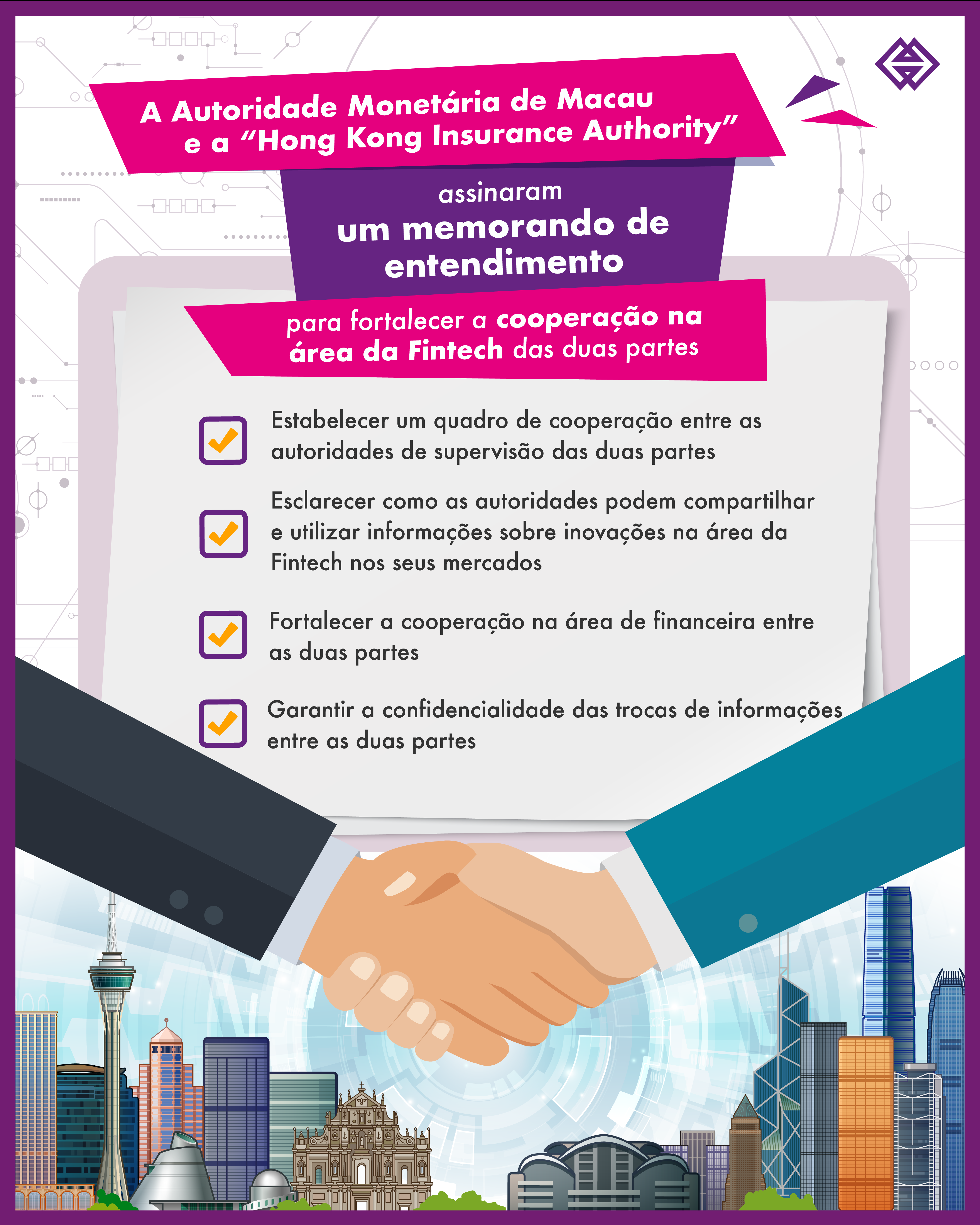 A Autoridade Monetária de Macau (AMCM) e a “Hong Kong Insurance Authority” (IA) assinaram hoje (1) o “Memorando de entendimento sobre cooperação na área da Fintech” com o objetivo de aprofundar a cooperação tecnológica financeira entre as duas partes e promover serviços financeiros inovadores.