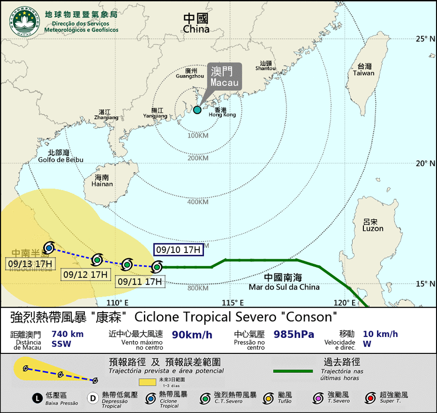 O Ciclone tropical Severo “Conson”continua a mover-se para Oeste e a afastar-se, gradualmente, de Macau. No início da próxima semana, o “Conson” vai deslocar-se para o Vietname. Além disso, o Super Tufão “Chanthu" está a dirigir-se para noroeste e vai deslocar-se para a coste leste de “Taiwan”. Dado que o impacto directo de "Conson" e " Chanthu" para Macau é reduzido, esta Direcção vai cancelar todos os sinais da tempestade tropical nas próximas horas.