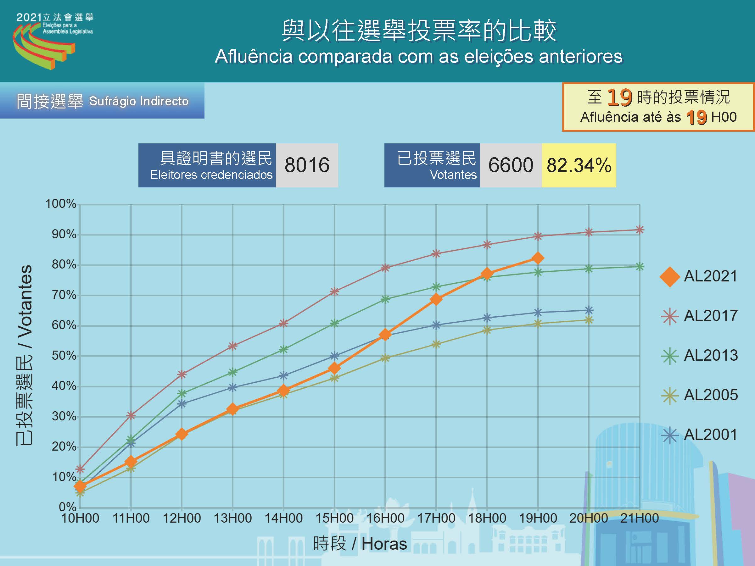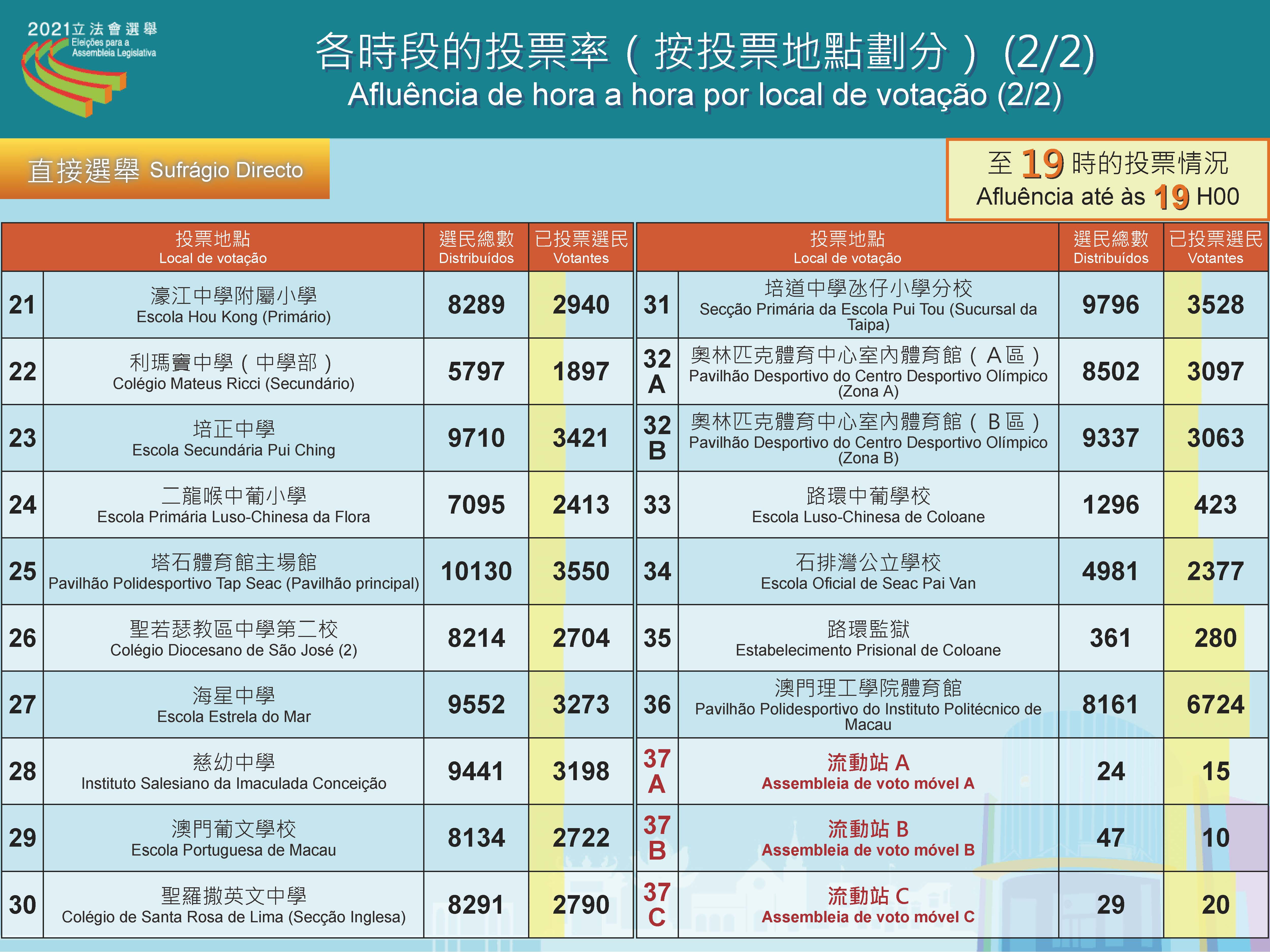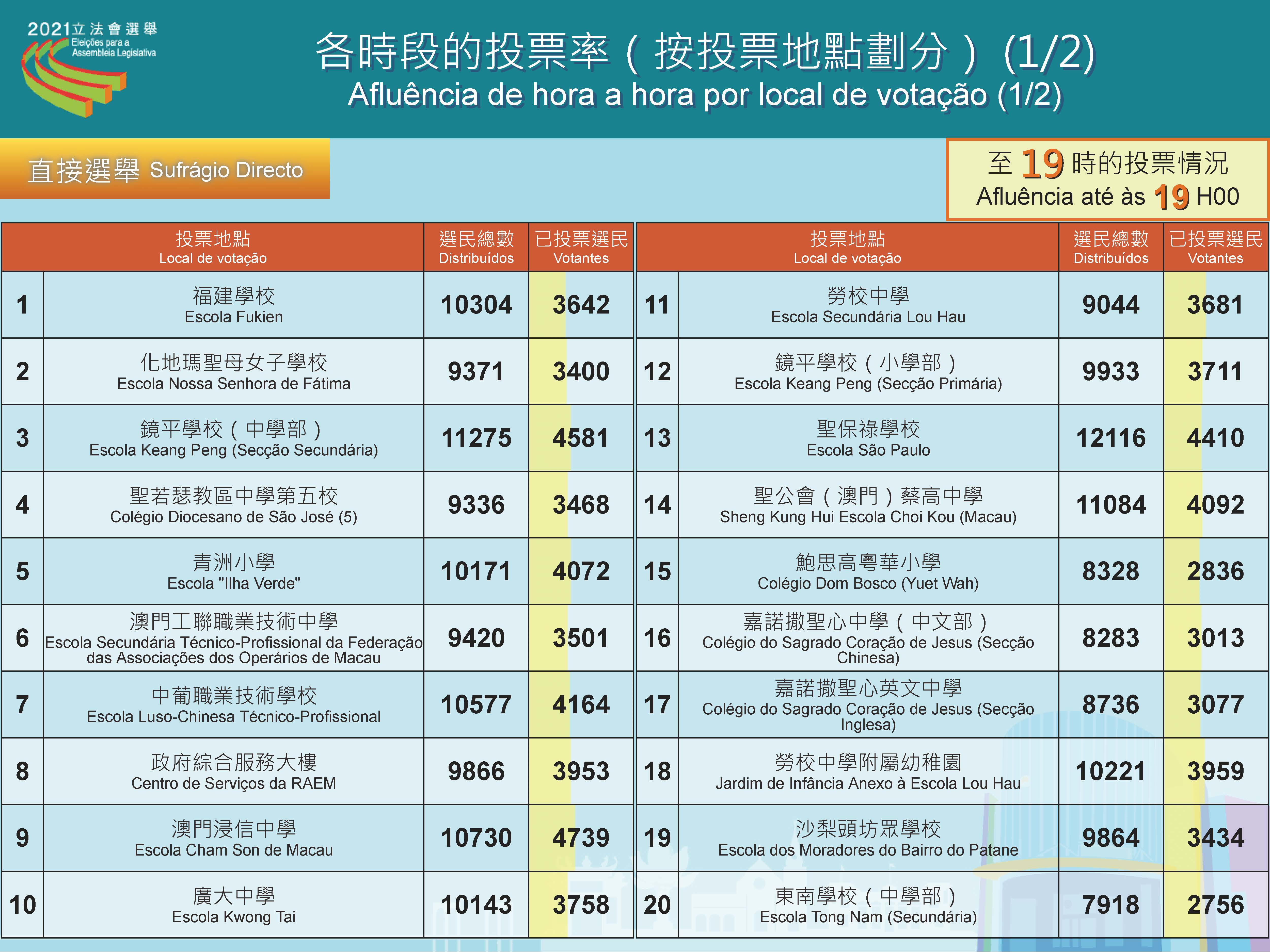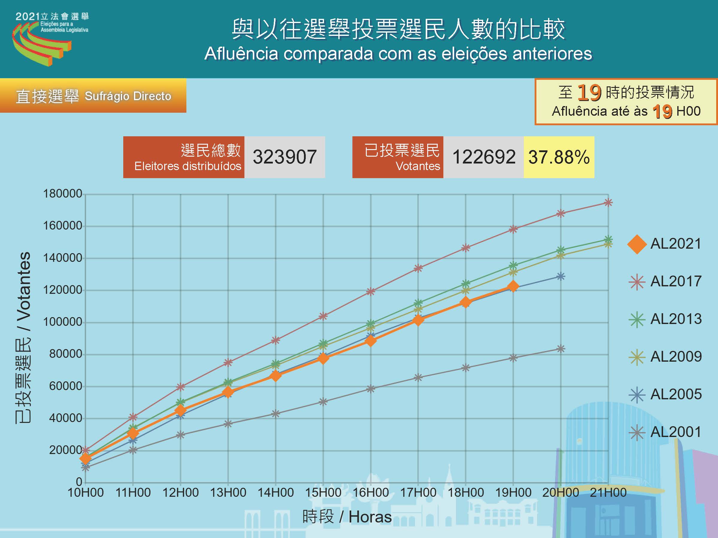 Até às 19h00, desde abertura das assembleias de voto, a taxa de afluência às urnas do sufrágio directo foi de 37,88 por cento, num total de 122 692 pessoas, que votaram nas Eleições da Assembleia Legislativa, 12 de Setembro. No sufrágio indirecto votaram 6 600 pessoas, representando uma taxa de afluência de 82,34 por cento.