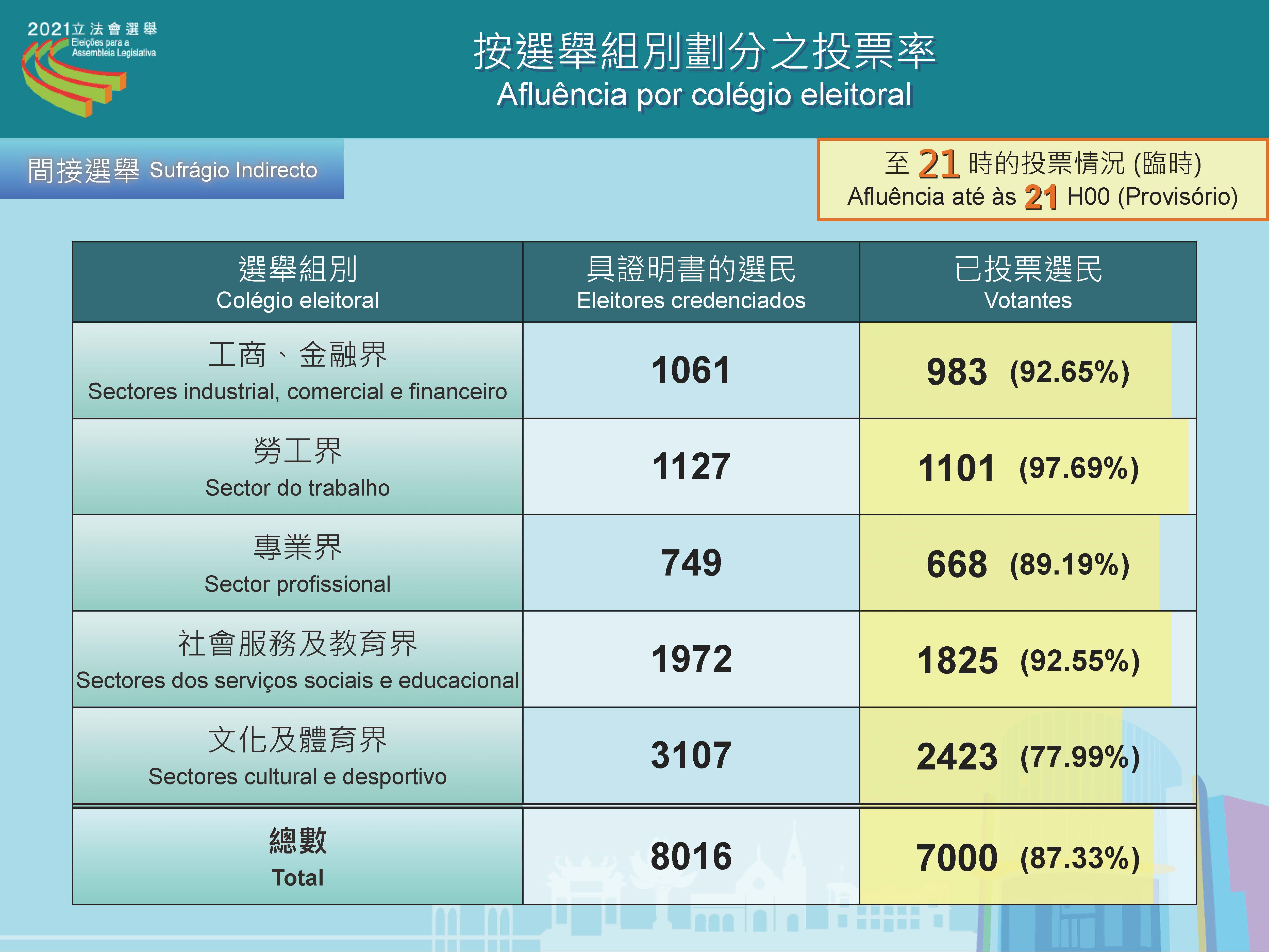 Concluída a votação para as eleições da VII AL, das 09h00 às 21h00, a taxa de afluência às urnas do sufrágio directo foi de 42,38 por cento, num total de 137 281 pessoas, que votaram nas Eleições da Assembleia Legislativa, 12 de Setembro. No sufrágio indirecto votaram 7 000 pessoas, representando uma taxa de afluência de 87,33 por cento.