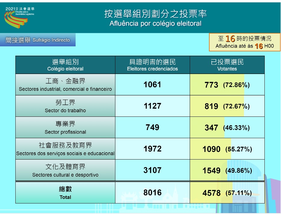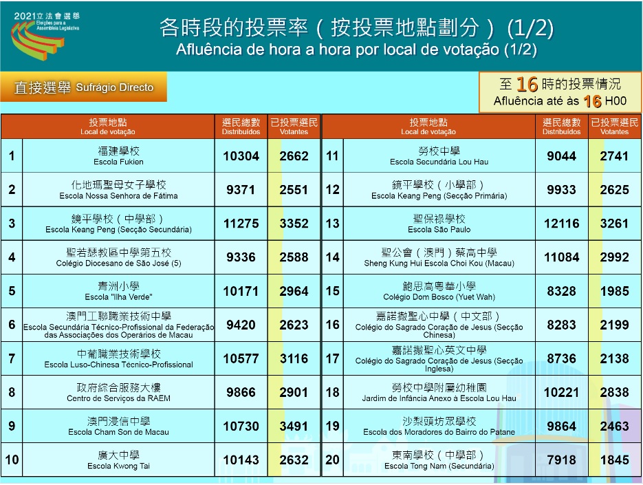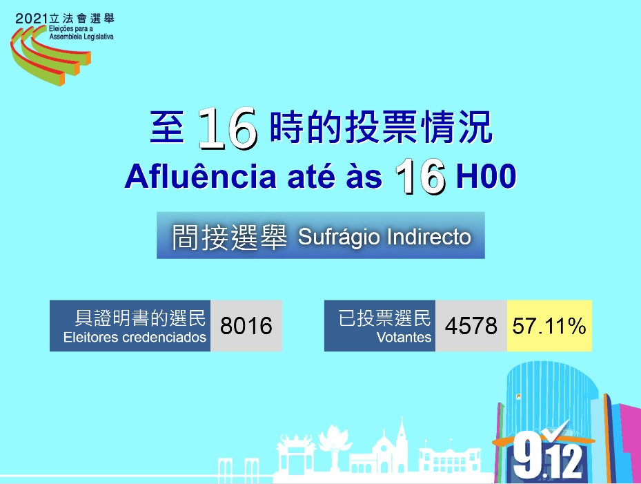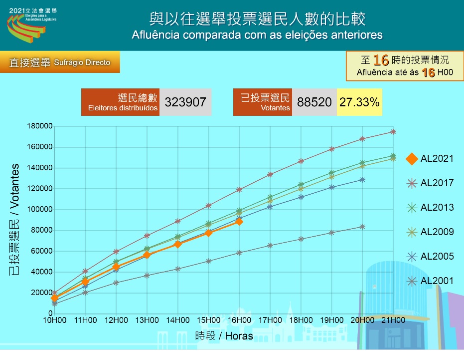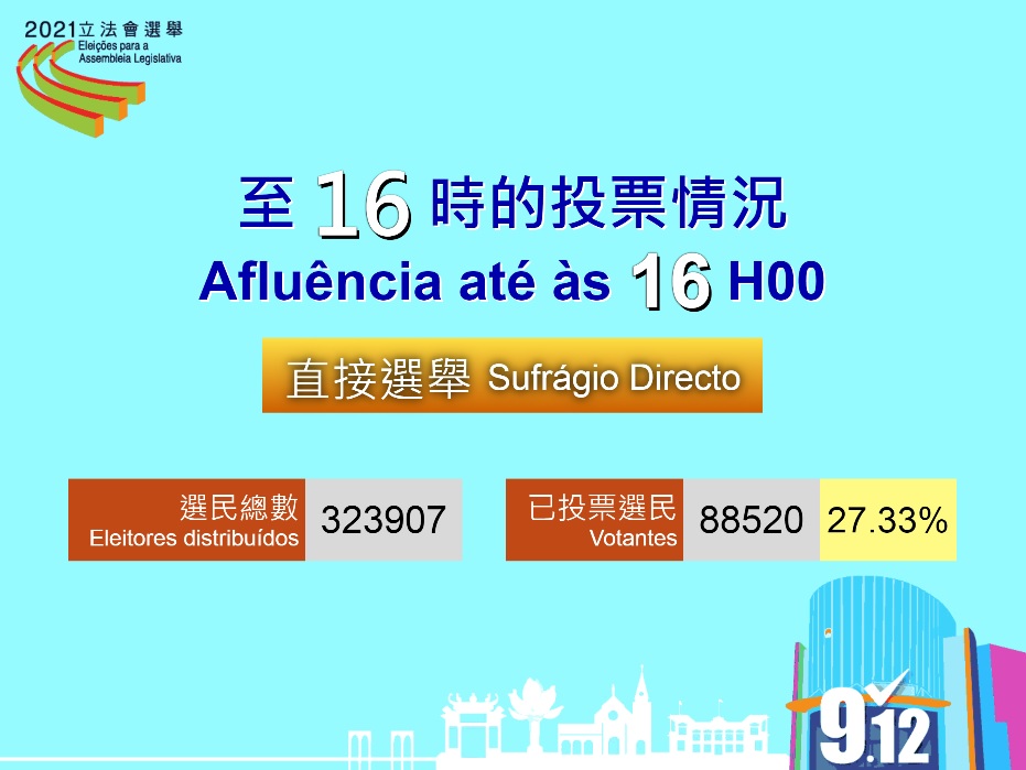 Nas primeiras sete horas desde abertura das assembleia de voto das Eleições da Assembleia Legislativa, dia 12 Setembro, até às 16 h00, votaram no sufrágio directo 88 520 pessoas, sendo a taxa de afluência 27,33 por cento. No sufrágio indirecto votaram 4 578 pessoas, representando uma taxa de afluência  de 57,11 por cento.