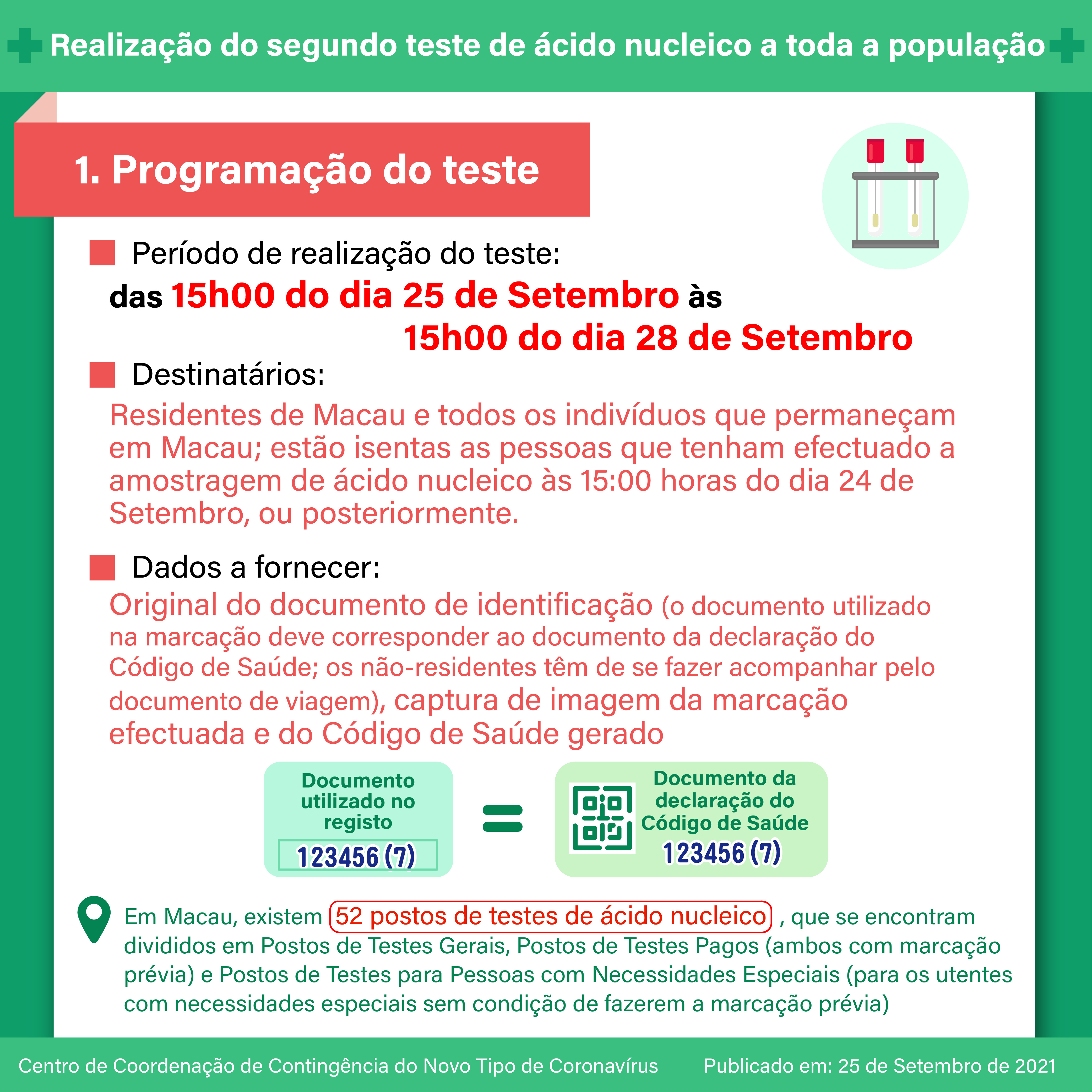 O Centro de Coordenação de Contingência do Novo Tipo de Coronavírus informa que a partir das 15h00 de sábado, 25 de Setembro, será realizado um teste em massa de ácido nucleico até às 15h00 do dia 28 de Setembro.
