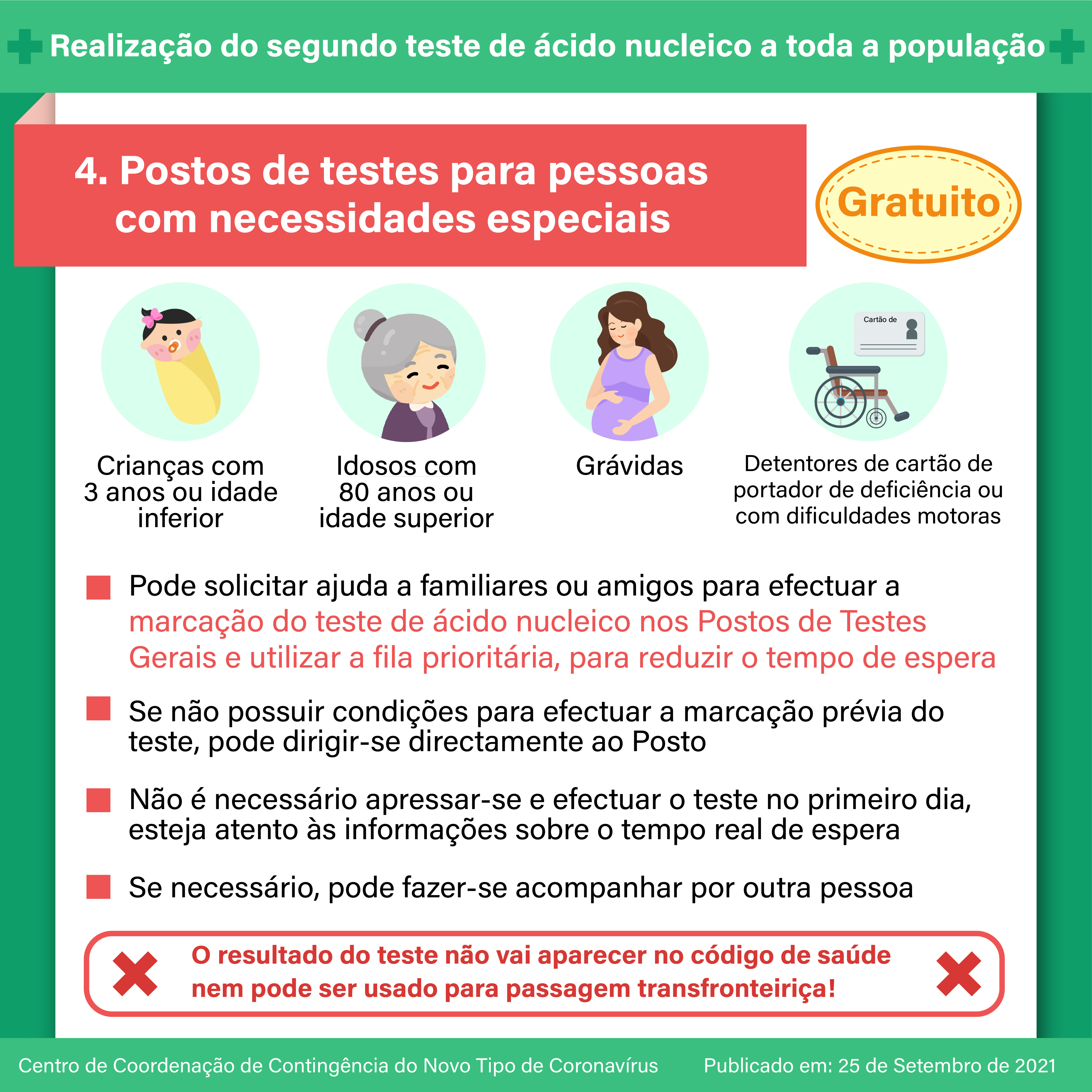 Antes de sair de casa, o público deve consultar as informações mais actualizadas sobre o posto onde vai realizar o teste e efectuar a sua deslocação de acordo com a situação e reduzir o seu tempo de espera. Os utentes com necessidades especiais não necessitam de se apressar a efectuar o teste no primeiro dia.
