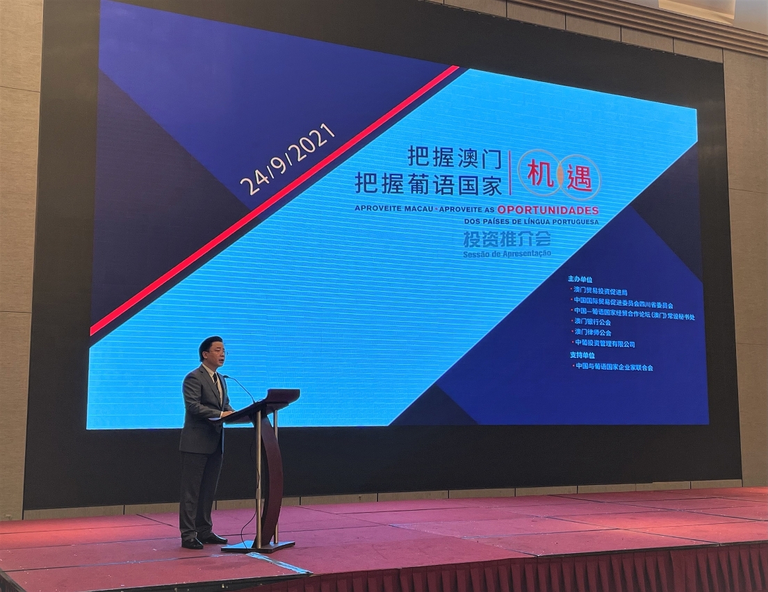 Em 24 de Setembro, o Secretariado Permanente do Fórum de Macau organizou, em conjunto com o IPIM e o Conselho de Promoção do Comércio Internacional de Sichuan, a Sessão de Apresentação “Aproveite Macau, aproveite as oportunidades dos Países de Língua Portuguesa”, evento em que o Secretário-Geral Adjunto, Ding Tian, o Vogal Executivo do IPIM, Vincent U, e a Vice-Presidente do Conselho de Promoção do Comércio Internacional de Sichuan, Lei Xuejie, participaram na Sessão e proferiram discursos.