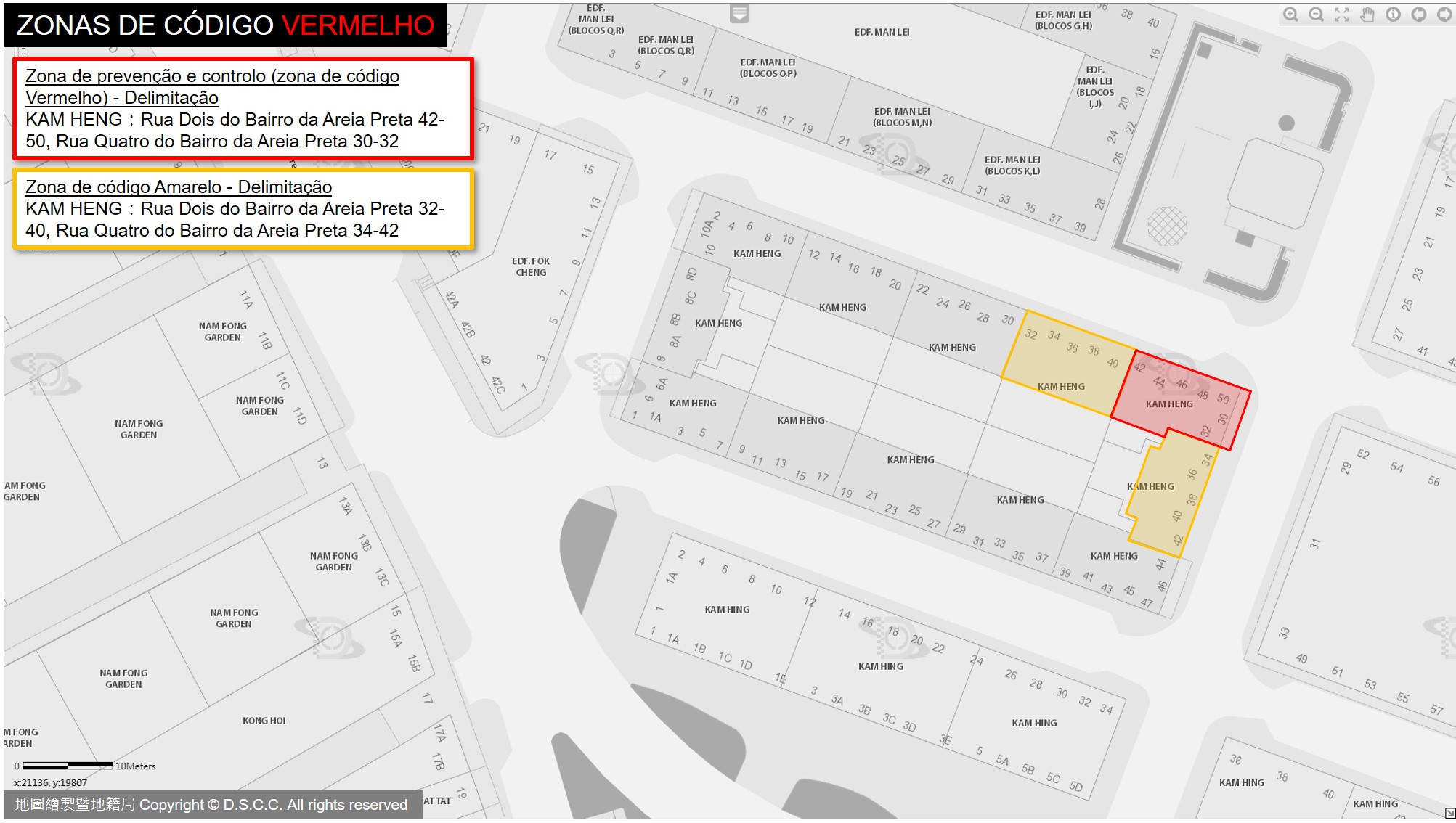 Zonas de código vermelho: Edf. Kam Heng, Rua Dois do Bairro da Areia Preta 42-50, Rua Quatro do Bairro da Areia Preta 30-32.