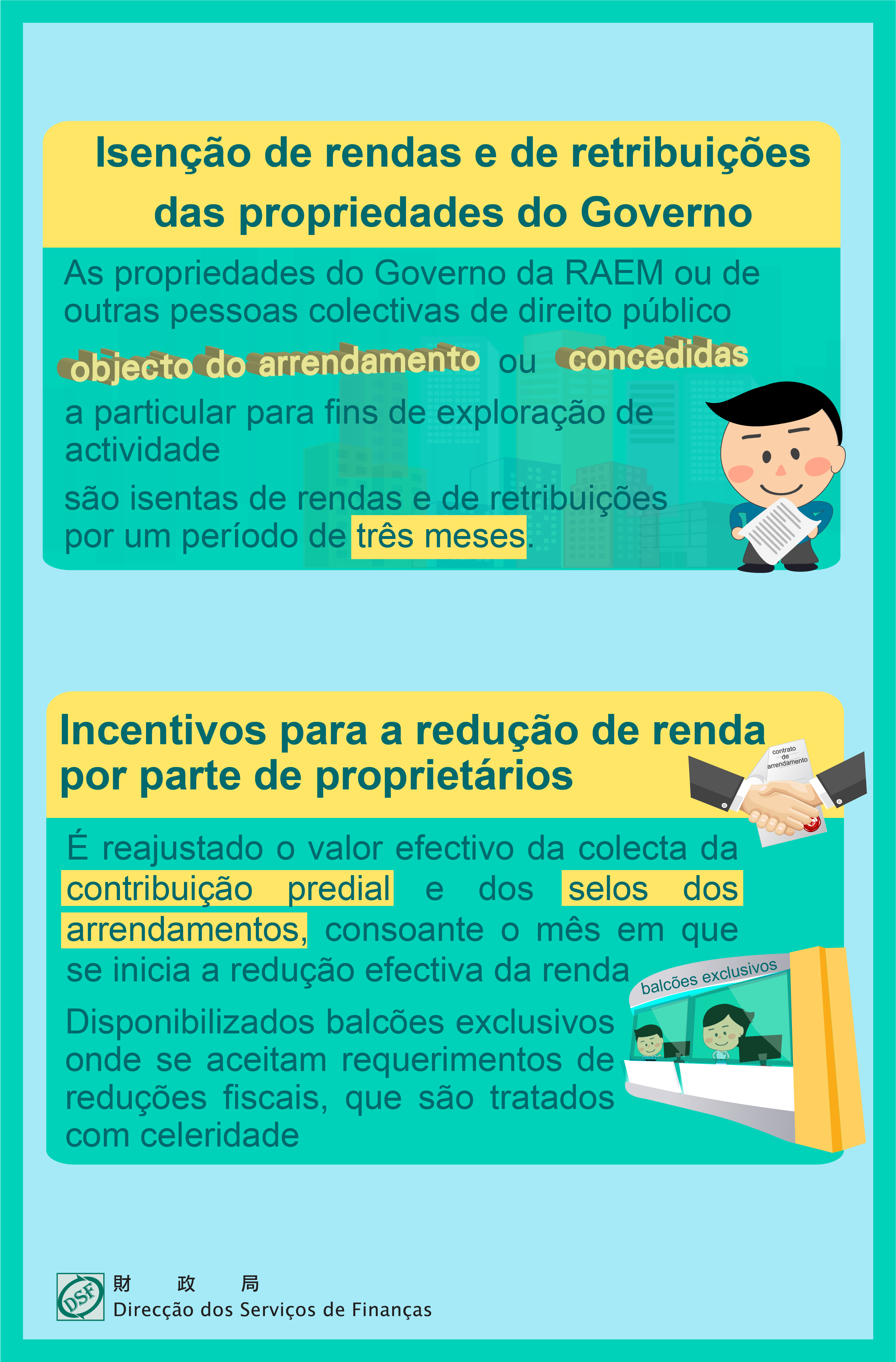 A fim de atenuar os custos de exploração das pequenas e médias empresas, o Governo da RAEM ou outras pessoas colectivas de direito público que forneçam arrendamento de propriedades ou que concedam propriedades a particular para fins de exploração de actividade, como por exemplo: lojas de habitação económica e de habitação social objecto do arrendamento, quiosques, esplanadas, cafés, snack bars, restaurantes, áreas de aluguer de bicicletas, lojas de presentes e áreas para máquinas de venda automática de bebidas, instalados nos locais públicos como jardins, zonas de lazer e instalações culturais, vão conceder a isenção de renda e de retribuições por um período de três meses.