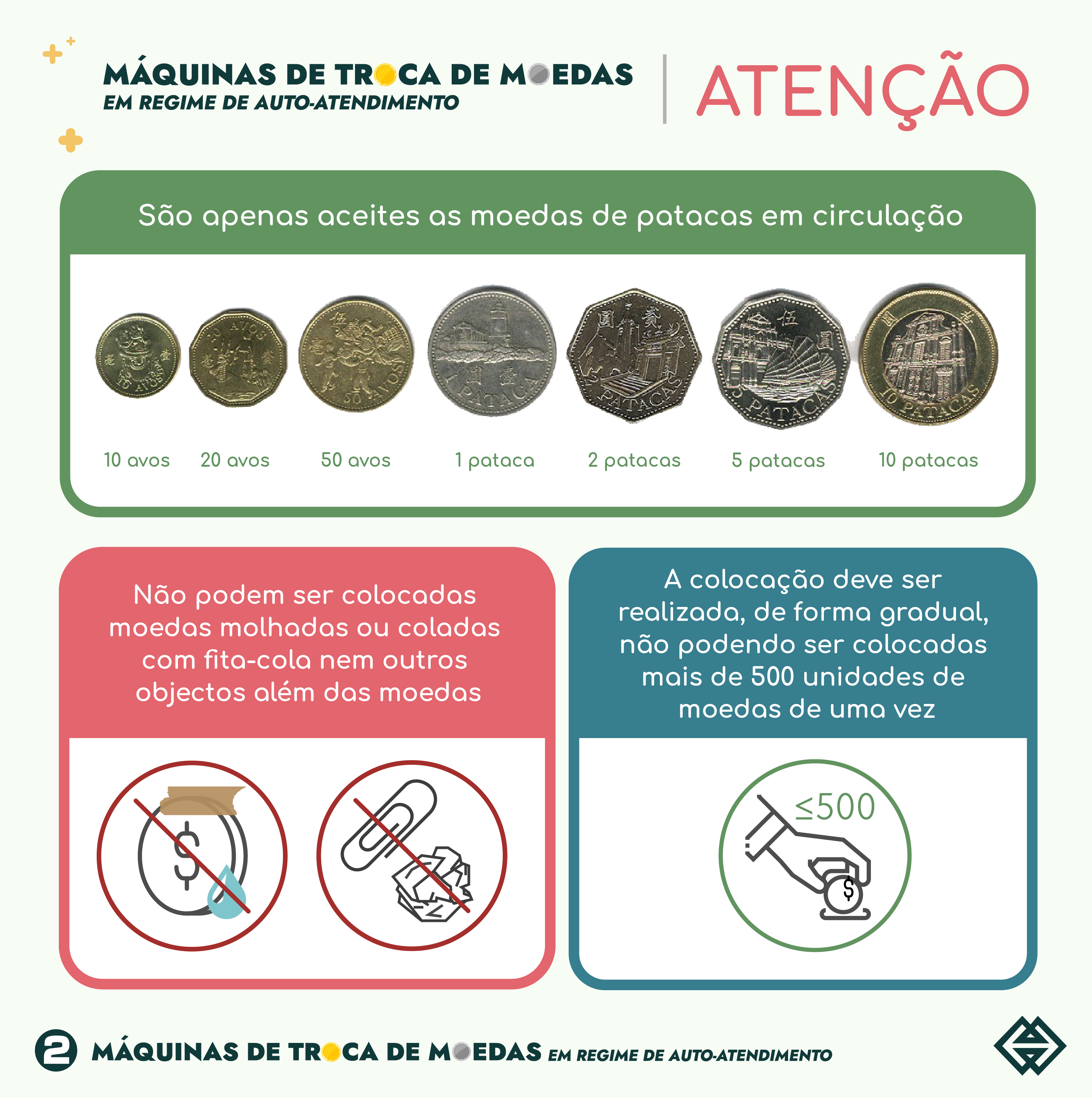 Durante a fase experimental, os residentes podem deslocar-se, durante o horário de expediente, às agências designadas pelos dois bancos (designadamente as agências do Banco da China - Agência San Ma Lou, Agência Hung Kai Sie e Agência Sap Yuet Chor Ng Kai e as agências do Banco Nacional Ultramarino, S.A. - Agência Iao Hon, Agência do NAPE e Agência Nova City) e procederem à troca das moedas de patacas em circulação em notas de patacas em circulação, através da utilização gratuita dos serviços a prestar pelas “máquinas de troca de moedas em regime de auto-atendimento”, sendo que as moedas não estão sujeitas a qualquer classificação antecipada por valor facial e podem ser colocadas, directamente, na máquina, uma vez que as mesmas podem ser trocadas por notas, após serem contadas e identificadas, automaticamente pela máquina. No entanto, para evitar a ocorrência de quaisquer avarias nas máquinas, os residentes devem estar cientes de que não podem ser colocados outros objectos além das moedas.