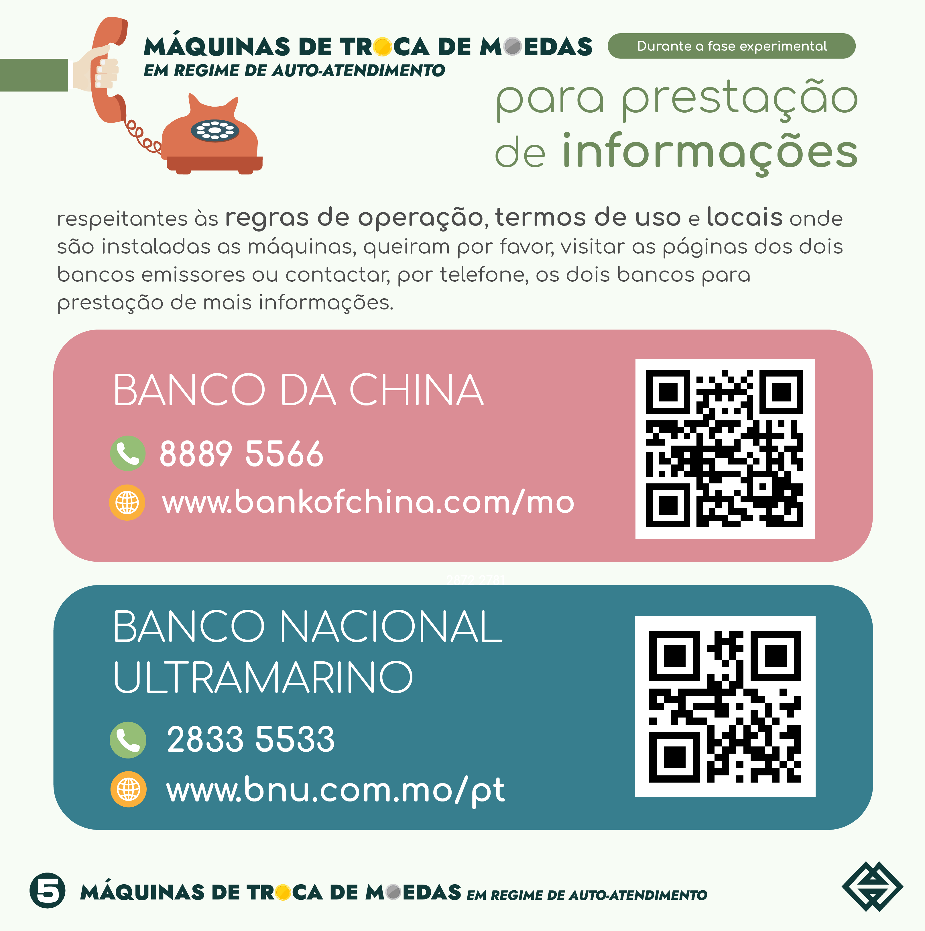 Para obtenção de informações detalhadas acerca das “máquinas de troca de moedas em regime de auto-atendimento”, designadamente as respeitantes às regras de operação, termos de uso e locais onde são instaladas as máquinas, queiram por favor, visitar as páginas dos dois bancos emissores ou contactar, por telefone, os dois bancos para prestação de mais informações.