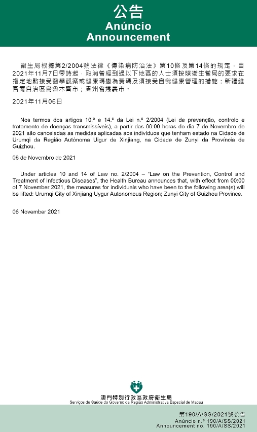 O Centro de Coordenação de Contingência do Novo Tipo de Coronavírus informa que tendo em consideração a evolução epidemiológica mais actualizada na Região Autónoma Uigur de Xinjiang e na Província de Guizhou, nos termos dos artigos 10.º e 14.º da Lei n.º 2/2004 (Lei de prevenção, controlo e tratamento de doenças transmissíveis), a partir das 00:00 horas do dia 7 de Novembro de 2021, serão canceladas as medidas aplicadas aos indivíduos que tenham estado na Cidade de Urumqi da Região Autónoma Uigur de Xinjiang, na Cidade de Zunyi da Província de Guizhou.