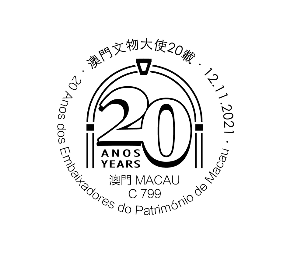 Para assinalar os 20 anos dos Embaixadores do Património de Macau, a Direcção dos Serviços de Correios e Telecomunicações informa que, no dia 12 de Novembro de 2021, haverá um Posto de Correio Temporário com o carimbo comemorativo “20 Anos dos Embaixadores do Património de Macau”, instalado na Loja de Filatelia da Estação Central, das 10h00 às 17h00 horas. No mesmo local, estarão à venda bilhetes postais comemorativos ao preço unitário de MOP3,00.