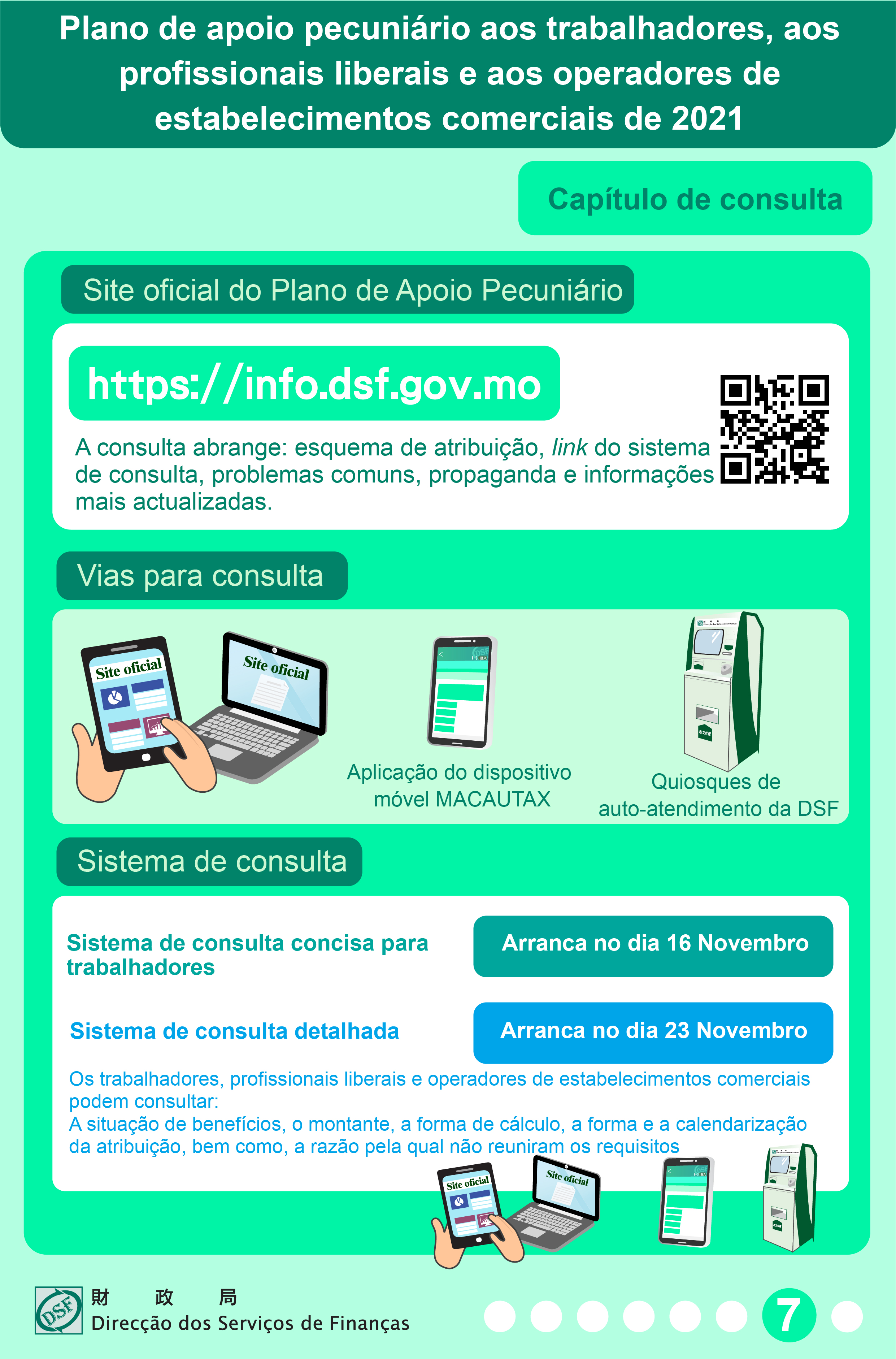 A DSF vai lançar, em 16 de Novembro, um site exclusivo (https://info.dsf.gov.mo) onde se disponibilizam, em detalhe, as seguintes informações relativas ao apoio pecuniário: forma de atribuição, sistema de consulta, questões frequentes, informações promocionais, novidades recentes, entre outras.