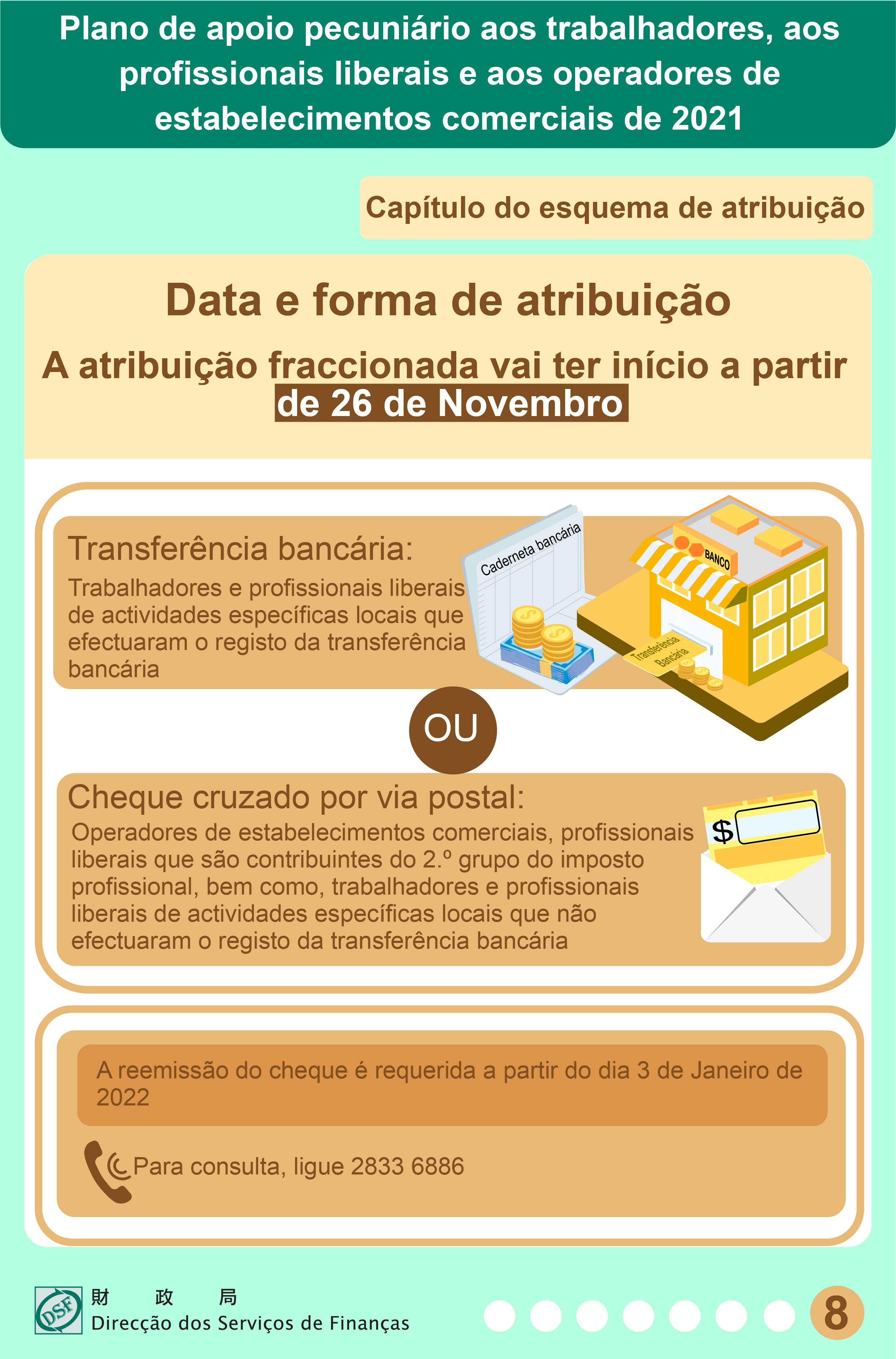 Para os operadores de estabelecimentos comerciais, os profissionais liberais contribuintes do 2.º grupo do Imposto Profissional, bem como os beneficiários que não tenham efectuado o registo da conta bancária para receber o apoio pecuniário por transferência, o apoio pecuniário vai ser atribuído através de cheque cruzado remetido por via postal, sendo o mesmo enviado, faseadamente, a partir de 26 de Novembro de 2021, prevendo-se a sua conclusão em quatro dias úteis.