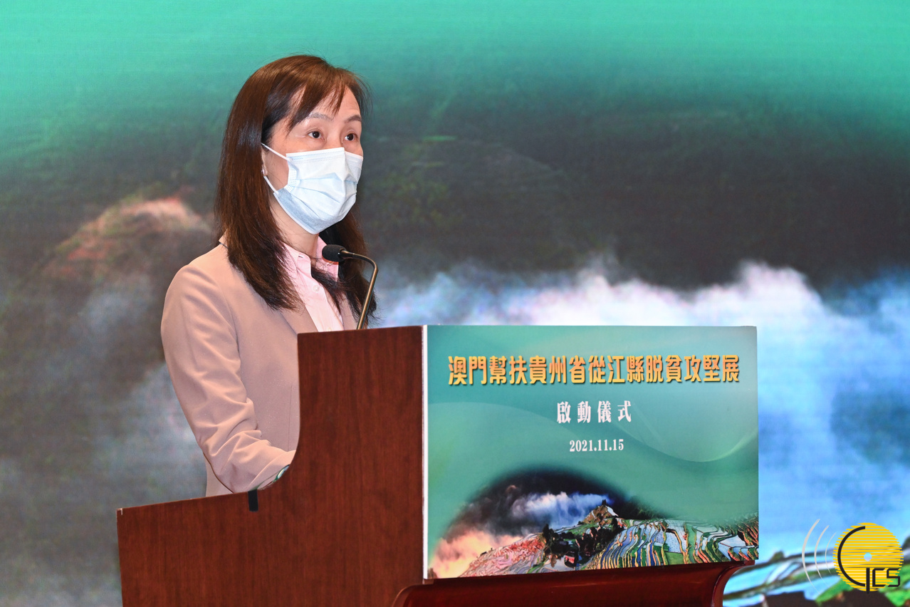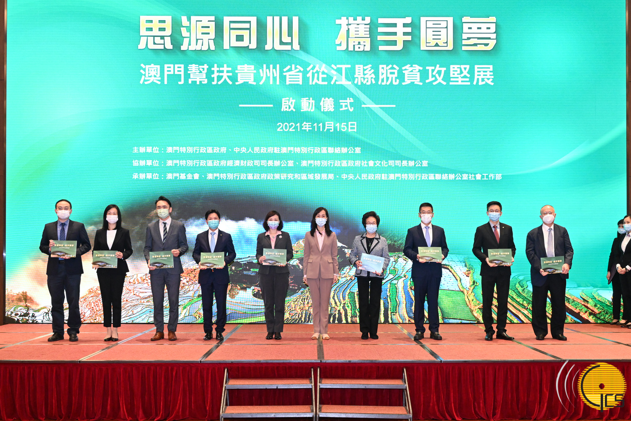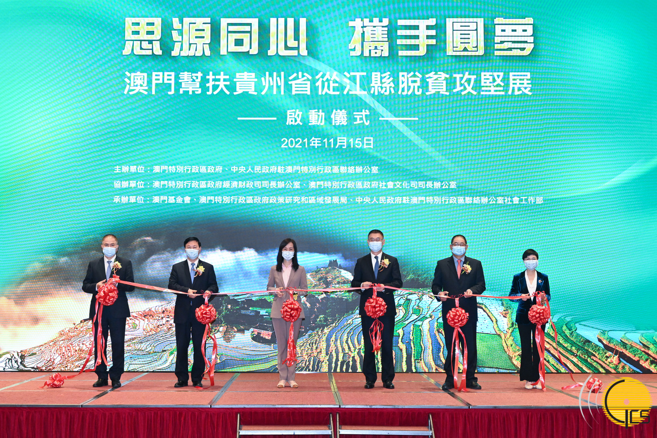 Na tarde do dia 15 de Novembro, realizou-se na sala polivalente do Edifício N1 da Universidade de Macau, a Cerimónia de Inauguração da Exposição sobre Apoio de Macau a Congjiang da Província de Guizhou na Lutra Contra a Pobreza. A Secretária para os Assuntos Sociais e Cultura do Governo da Região Administrativa Especial de Macau (RAEM), Ao Ieong U, o Subdirector do Gabinete de Ligação do Governo Popular Central na RAEM, Yao Jin, o Chefe do Departamento da Revitalização Rural de Guizhou, Mu Rongkun, o Presidente da Fundação de Macau, Wu Zhiliang, o Secretário-Geral Adjunto e Chefe do Departamento para os Assuntos Sociais, Huang Huagai, a membro do Comité Permanente do Partido Comunista da China (PCC), Chefe do Departamento de Propagação e Chefe do Departamento da Frente Unida do Distrito de Congjiang, Zhao Lingzhi estiveram presentes e co-presidiram a cerimónia.