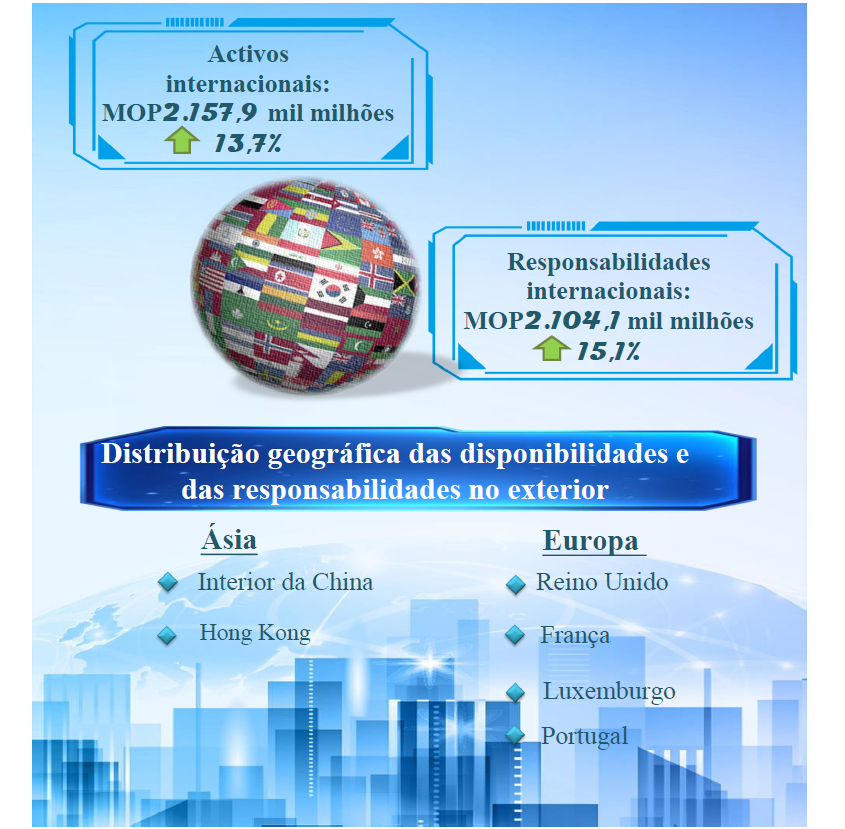 A actividade bancária internacional de Macau distribuiu-se principalmente pela Ásia e Europa. Até final de Setembro de 2021 as quotas das disponibilidades do sistema bancário de Macau no Interior da China e em Hong Kong, foram de 43,4% e 28,1%, respectivamente; em relação ao Luxemburgo e a Portugal, ambos quotas foram de 0,9%, no total de activo exterior. Entretanto, as quotas das disponibilidades nos países de língua portuguesa e nos países localizados ao longo da iniciativa “Uma Faixa, Uma Rota” ocuparam 1,3% e 8,0%, respectivamente. Quanto ao passivo sobre o exterior, registaram quotas de 39,8% e 36,0% para o Interior da China e Hong Kong, respectivamente; no que respeita ao passivo sobre o Reino Unido e a França, as suas quotas foram de 5,0% e 4,2% do total de passivo sobre o exterior. Relativamente aos países de língua portuguesa e aos países localizados ao longo da iniciativa “Uma Faixa, Uma Rota” registaram quotas de 0,6% e 7,6%, respectivamente.