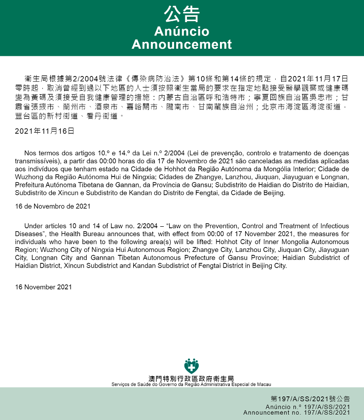 O Centro de Coordenação de Contingência do Novo Tipo de Coronavírus informa que tendo em consideração a evolução epidemiológica mais actualizada na Região Autónoma da Mongólia Interior, Região Autónoma Hui de Ningxia, Província de Gansu e na Cidade de Beijing, nos termos dos artigos 10.º e 14.º da Lei n.º 2/2004 (Lei de prevenção, controlo e tratamento de doenças transmissíveis), a partir das 00:00 horas do dia 17 de Novembro de 2021 são canceladas as medidas aplicadas aos indivíduos que tenham estado na Cidade de Hohhot da Região Autónoma da Mongólia Interior; Cidade de Wuzhong da Região Autónoma Hui de Ningxia; Cidades de Zhangye, Lanzhou, Jiuquan, Jiayuguan e Longnan, Prefeitura Autónoma Tibetana de Gannan, da Província de Gansu; Subdistrito de Haidian do Distrito de Haidian, Subdistrito de Xincun e Subdistrito de Kandan do Distrito de Fengtai, da Cidade de Beijing.