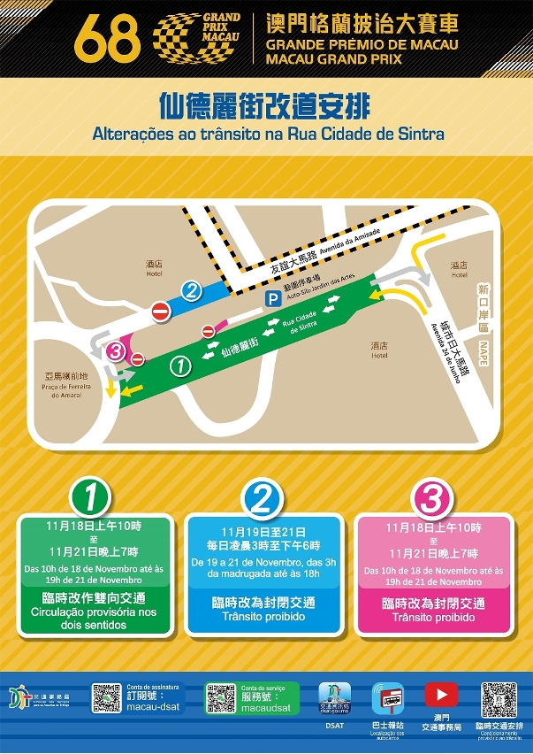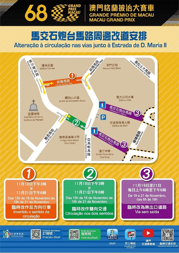 Em articulação com a realização da 68.ª edição do Grande Prémio de Macau, o circuito e as vias adjacentes estarão sujeitas a várias medidas de condicionamento provisório ao trânsito entre 18 (Quinta-feira) e 21 (Domingo) de Novembro. Entre 19 (Sexta-feira) e 21 (Domingo) de Novembro serão criados autocarros expressos gratuitos, a saber carreiras n.os 12T e 31T, proporcionando ligação entre o Terminal Marítimo do Porto Exterior e a Praça de Ferreira do Amaral/Fórum. Durante o mesmo período, a carreira n.º H2 será suspensa e terá lugar a alteração aos percursos de 49 carreiras de autocarros a partir da primeira saída até à reabertura do circuito daquele dia. Relativamente às informações sobre os condicionamentos provisórios ao trânsito, e alteração aos percursos de autocarros, os interessados devem fazer scan do código QR para aceder à respectiva página electrónica da DSAT.
