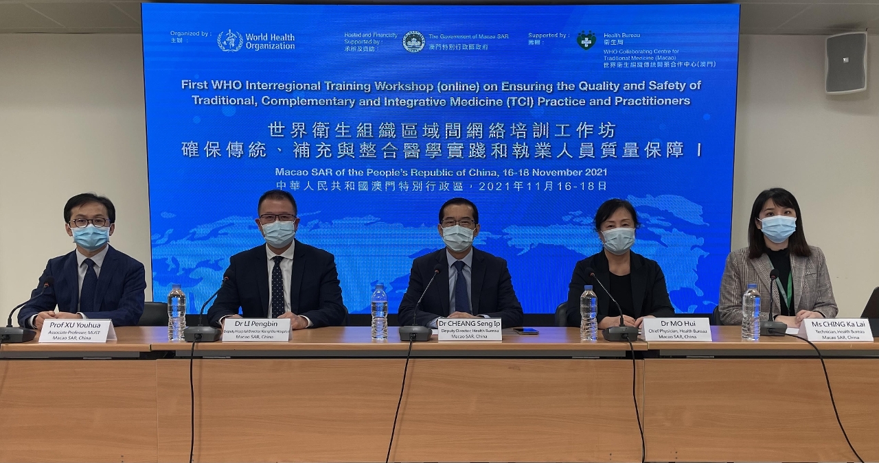 O Workshop de formação inter-regional da Organização Mundial da Saúde “Garantia da prática da medicina tradicional, complementar e integrativa e da qualidade do pessoal que exerce actividade profissional”, organizado pela Organização Mundial da Saúde, patrocinado e coorganizado pelo Governo da RAEM, preparado pelo Centro de Cooperação dos de Medicina Tradicional da OMS dos Serviços de Saúde de Macau, e está a decorrer na internet até 18 de Novembro, devido à situação epidemica.