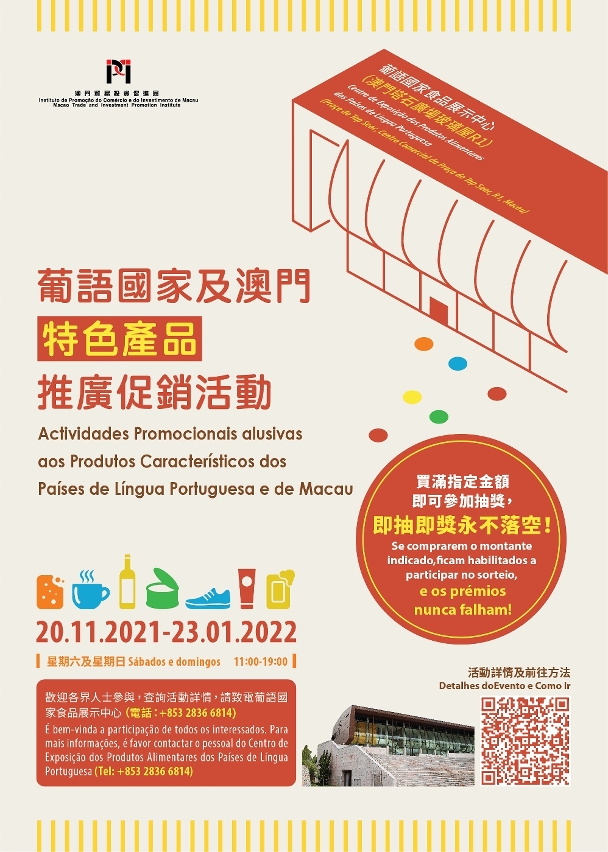 As “Actividades Promocionais alusivas aos Produtos Característicos dos Países de Língua Portuguesa e de Macau”, organizadas pelo Instituto de Promoção do Comércio e do Investimento de Macau (doravante designado por “IPIM”), terão lugar nos sábados e domingos, entre os dias 20 de Novembro de 2021 e 23 de Janeiro de 2022 (das 11h00 a 19h00), no Centro de Exposição dos Produtos Alimentares dos Países de Língua Portuguesa (também conhecido por “Casa de Vidro”). Este evento já é o segundo deste ano, após o do Maio. O IPIM organizará 17 agentes comerciais de produtos alimentares dos países lusófonos em Macau e empresas de produtos com características de Macau para exibir e vender os seus produtos. O IPIM espera que com essas actividades promocionais se possam potencializar o papel de Macau como plataforma entre a China e os países de língua portuguesa, bem como contribuir para a promoção de produtos com características próprias de Macau, ajudando as empresas de Macau na procura de parceiras e na expansão do mercado de marketing.