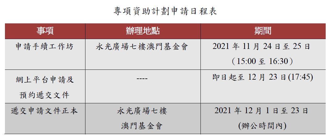 O período para efectuar o pedido relativo aos cinco programas específicos para concessão de apoio financeiro decorrerá entre 19 de Novembro e 23 de Dezembro de 2021, os estatutos destes cinco programas já estão no website da FM e os interessados devem efectuar, previamente, o pedido através da plataforma online e posteriormente entregar junto da FM, e no prazo referido, cópia do formulário preenchido devidamente assinado e carimbado, os pedidos extemporaneamente apresentados não vão ser atendidos. Devido às restrições impostas pela pandemia, os requerentes devem marcar através do sistema online, previamente, a entrega dos documentos. Para mais pormenores, a FM vai realizar entre as 15h e 16h30 do dia 24 e dia 25 de Novembro nas instalações da sua sede (Avenida de Almeida Ribeiro, nºs 61-75, Circle Square,7° piso, Macau) uma sessão de esclarecimento, os interessados, devem contactar a FM, durante as horas de expediente, através dos n.ºs º 87950952 / 87950948, para reserva de lugar sentado.