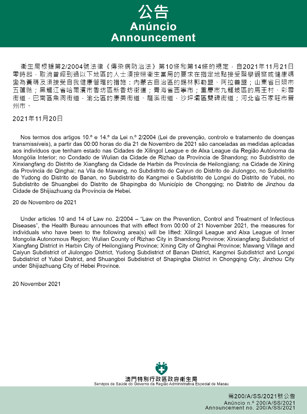 Também a partir das 00:00 horas do dia 21 de Novembro de 2021 são canceladas as medidas aplicadas aos indivíduos que tenham estado nas Cidades de Xilingol League e de Alxa League da Região Autónoma da Mongólia Interior; no Condado de Wulian da Cidade de Rizhao da Província de Shandong; no Subdistrito de Xinxiangfang do Distrito de Xiangfang da Cidade de Harbin da Província de Heilongjiang; na Cidade de Xining da Província de Qinghai; na Vila de Mawang, no Subdistrito de Caiyun do Distrito de Jiulongpo, no Subdistrito de Yudong do Distrito de Banan, no Subdistrito de Kangmei e Subdistrito de Longxi do Distrito de Yubei, no Subdistrito de Shuangbei do Distrito de Shapingba do Município de Chongqing; no Distrito de Jinzhou da Cidade de Shijiazhuang da Província de Hebei.