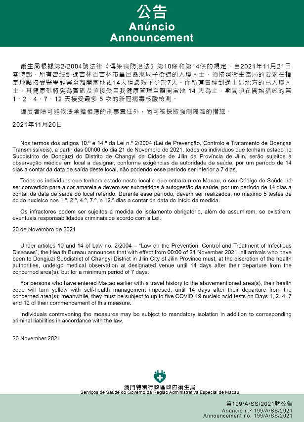 O Centro de Coordenação de Contingência do Novo Tipo de Coronavírus informa que tendo em consideração a evolução epidemiológica mais actualizada da Província de Jilin nos termos dos artigos 10.º e 14.º da Lei n.º 2/2004 (Lei de Prevenção, Controlo e Tratamento de Doenças Transmissíveis), a partir das 00h00 do dia 21 de Novembro de 2021, todos os indivíduos que tenham estado no Subdistrito de Dongjuzi do Distrito de Changyi da Cidade de Jilin da Província de Jilin, serão sujeitos à observação médica em local a designar, conforme exigências da autoridade de saúde, por um período de 14 dias a contar da data de saída deste local, não podendo esse período ser inferior a 7 dias.