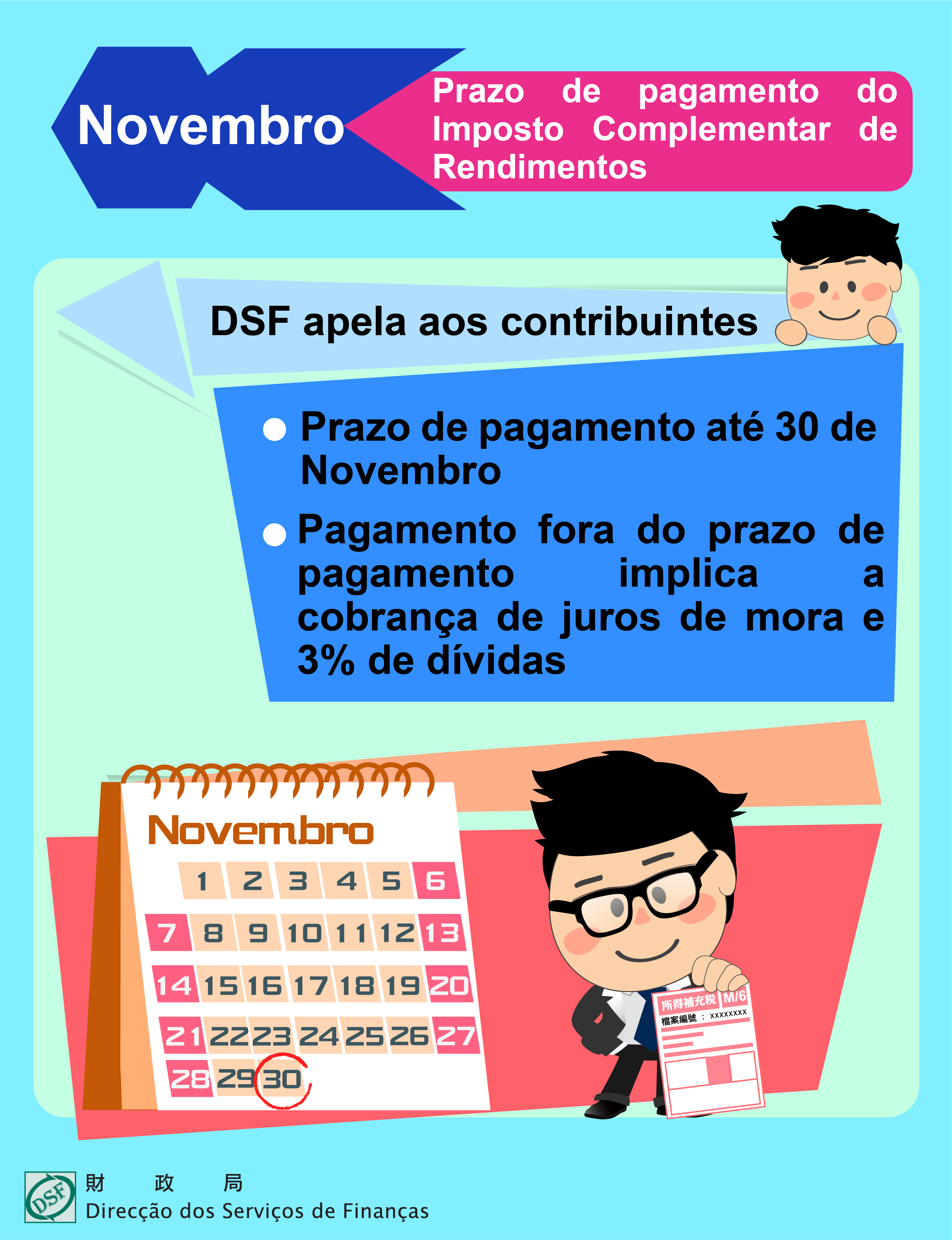 A Direcção dos Serviços de Finanças vem lembrar os contribuintes que o prazo de pagamento da 2.ª prestação do Imposto Complementar de Rendimentos termina no próximo dia 30 de Novembro. o não pagamento da mesma dentro do mês de vencimento que consta do conhecimento da cobrança (Novembro) implica a cobrança de juros de mora e 3% de dívidas. Para evitar perdas de tempo de espera ou o pagamento adicional de juros de mora e multa devido ao pagamento fora do prazo, esta Direcção de Serviços apela aos contribuintes que ainda não o fizeram para efectuarem o respectivo pagamento com a maior brevidade possível, por meio das formas de pagamento disponibilizadas pelos Serviços de Finanças, podendo ainda fazê-lo dentro das horas de expediente, nos balcões dos Bancos indicados ou por sua transacção electrónica, além disso, utilize a aplicação móvel (MACAU TAX) da DSF para digitalizar o QRcode do conhecimento de cobrança, para ligar-se à plataforma de pagamento móvel, e efectuar o pagamento do imposto ou nas Recebedorias instaladas, respectivamente, no Edifício “Finanças”, no Edifício “Long Cheng”, no Centro de Serviços da RAEM e no Centro de Serviços da RAEM das Ilhas.