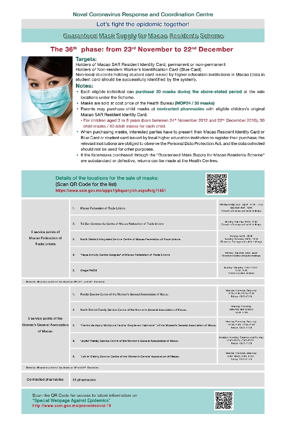 O Centro de Coordenação de Coordenação de Contingência do Novo Tipo de Coronavírus informa que no próximo dia 23 de Novembro, Terça-feira, terá inicio o 36.º Plano de fornecimento de máscaras destinado aos residentes de Macau. O período de venda irá decorrer durante 30 dias, entre 23 de Novembro e 22 de Dezembro de 2021.