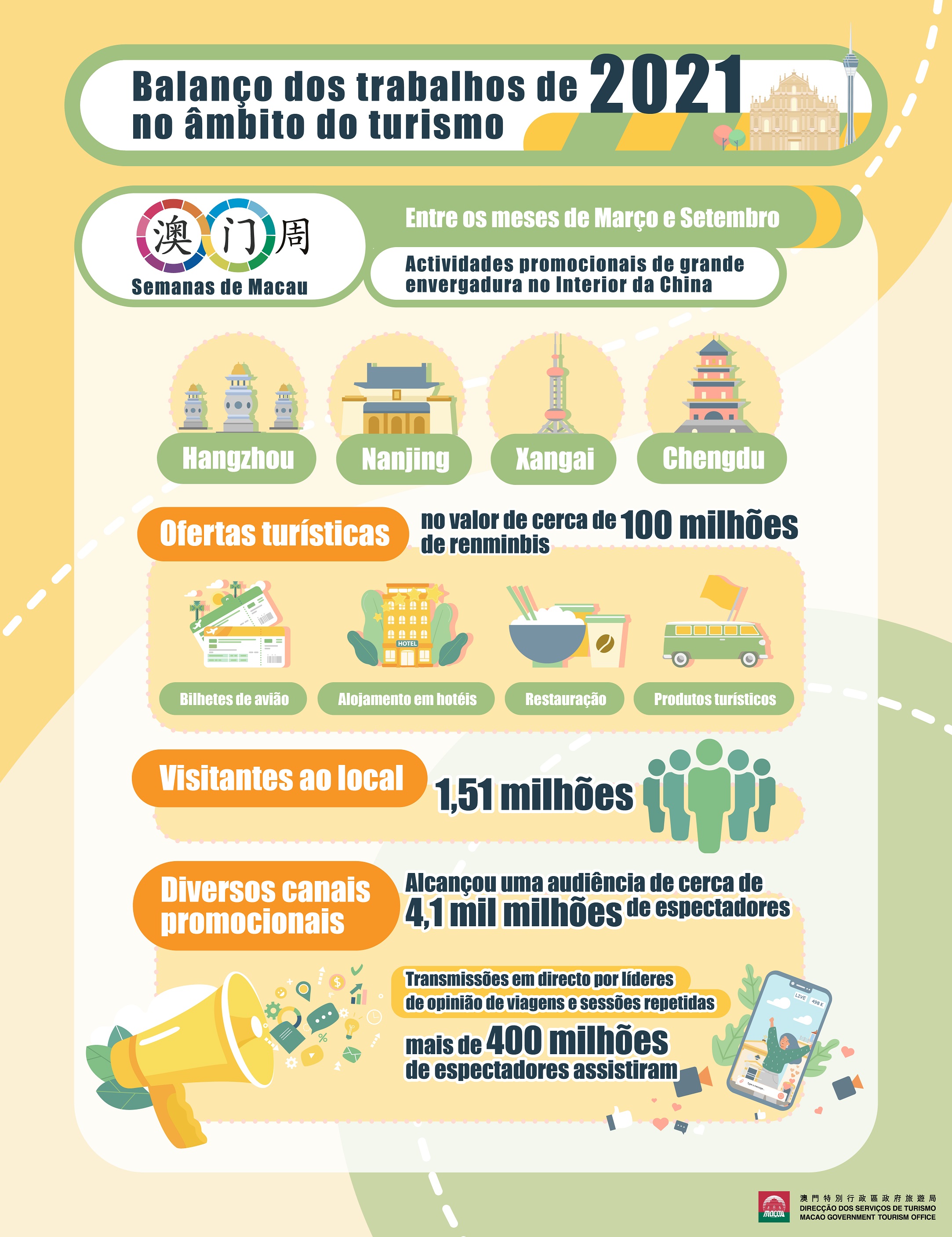Sob o cumprimento rigoroso das orientações de prevenção da pandemia, a DST organizou em Macau e no Interior da China vários eventos de grande envergadura, incluindo as “Semanas de Macau” em diversas cidades, para desenvolver ordenadamente uma série de trabalhos de promoção do turismo online e presenciais. Por outro lado, a DST continua a organizar uma diversidade de eventos e a apoiar a realização de actividades comunitárias levadas a cabo por associações e operadores turísticos.