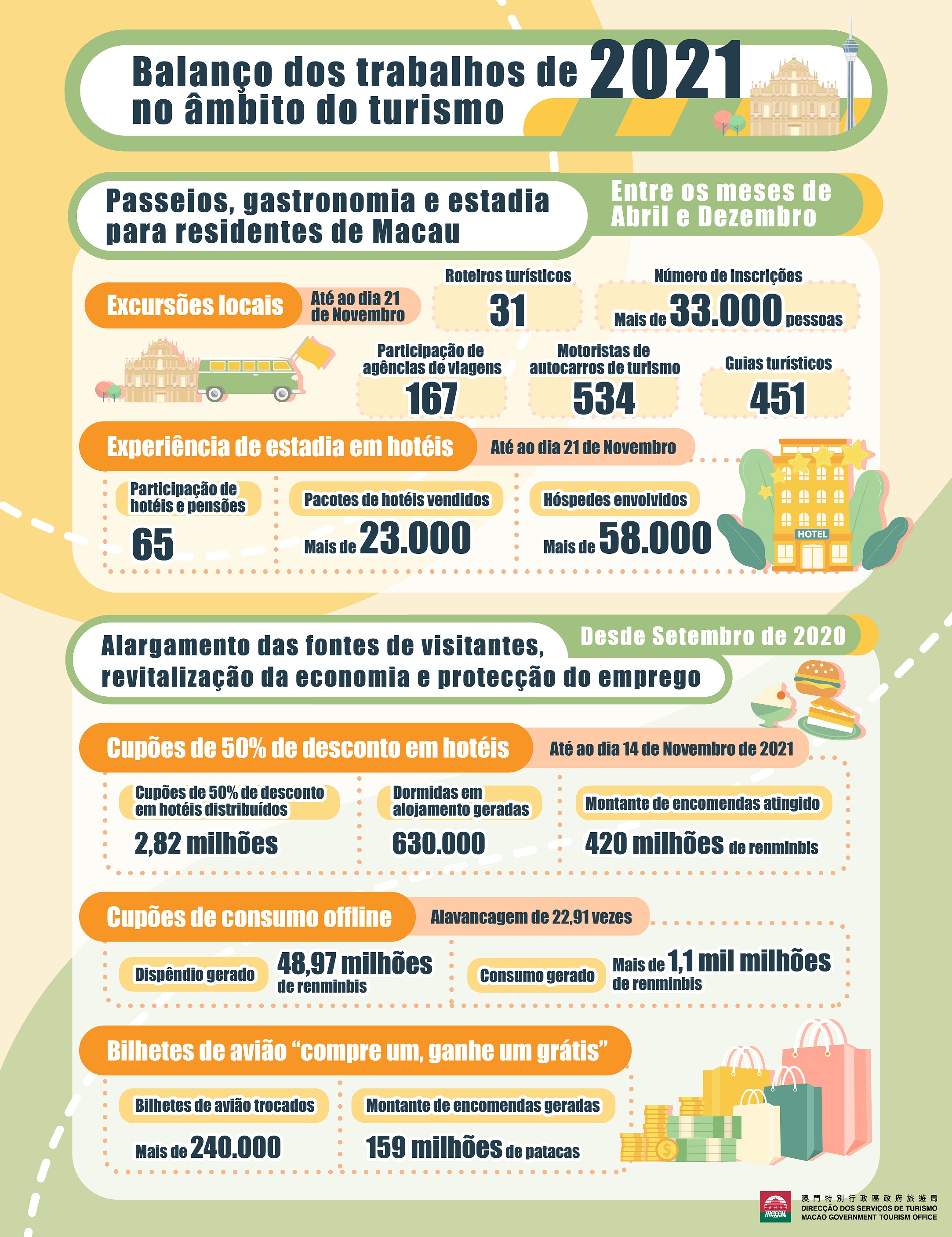 A DST e a indústria lançaram o programa “Passeios, gastronomia e estadia para residentes de Macau”, a decorrer desde Abril até Dezembro, continuando a criar oportunidades de emprego para os operadores turísticos através do conceito de “Trabalho Sim, Caridade Não”, e com vista a promover a procura interna e o consumo em bairros comunitários, promovendo a recuperação do turismo e dos sectores relacionados. Por outro lado, a DST criou condições para apoiar os operadores turísticos no lançamento dos “Roteiros Turísticos Seleccionados de Macau” tendo como alvo os visitantes, para aumentar a experiência turística de Macau através de itinerários individuais e personalizados.