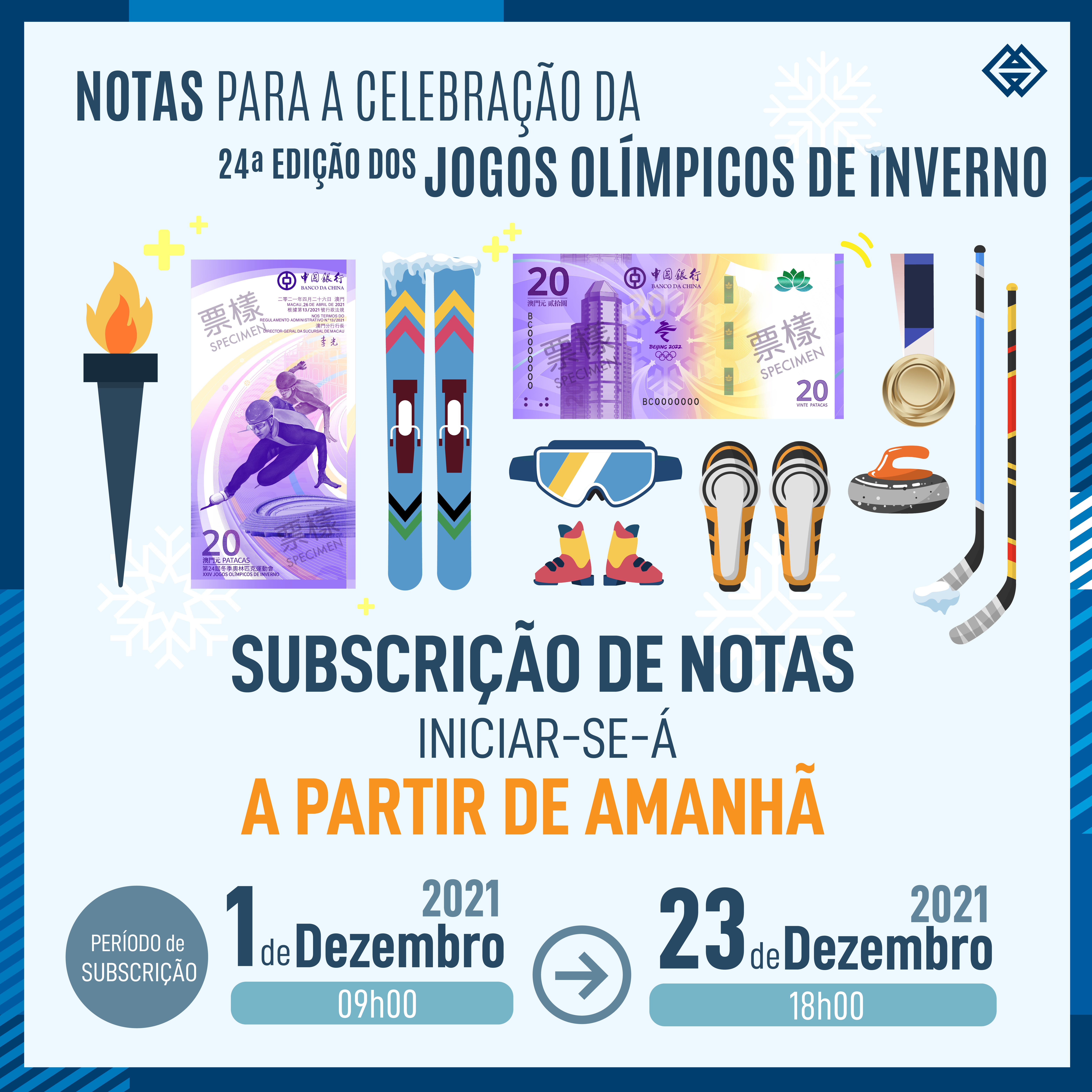 A subscrição das notas para a celebração da 24ª Edição dos Jogos Olímpicos de Inverno será iniciada a partir das 9 horas de 1 de Dezembro de 2021, podendo os residentes de Macau efectuar a subscrição através da página electrónica da Autoridade Monetária de Macau (AMCM). Cada residente pode apenas apresentar uma subscrição e o número de notas disponibilizadas para troca fixa-se em 2 (duas) unidades, terminando o prazo de subscrição às 18 horas de 23 de Dezembro de 2021.
