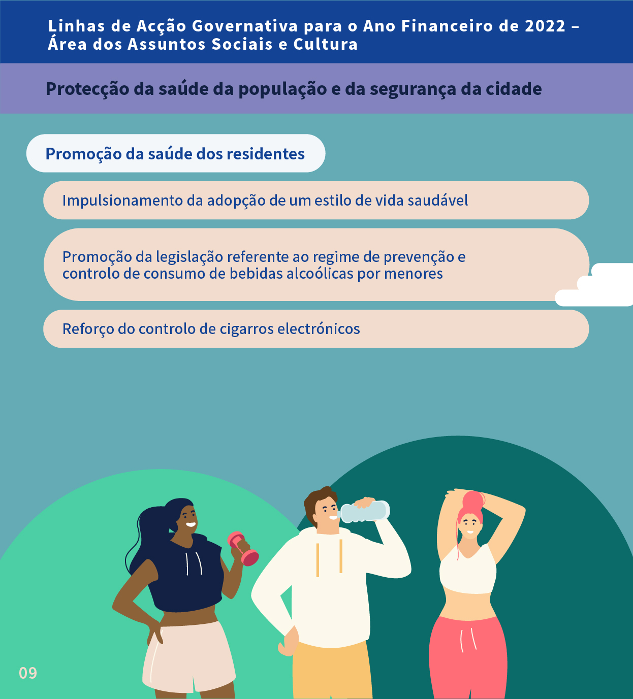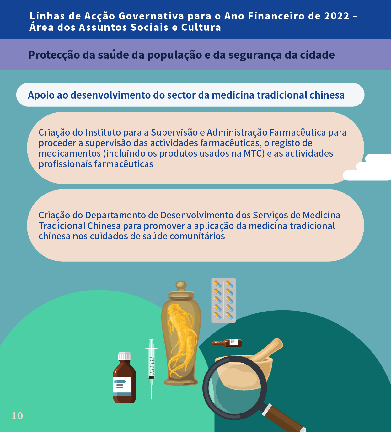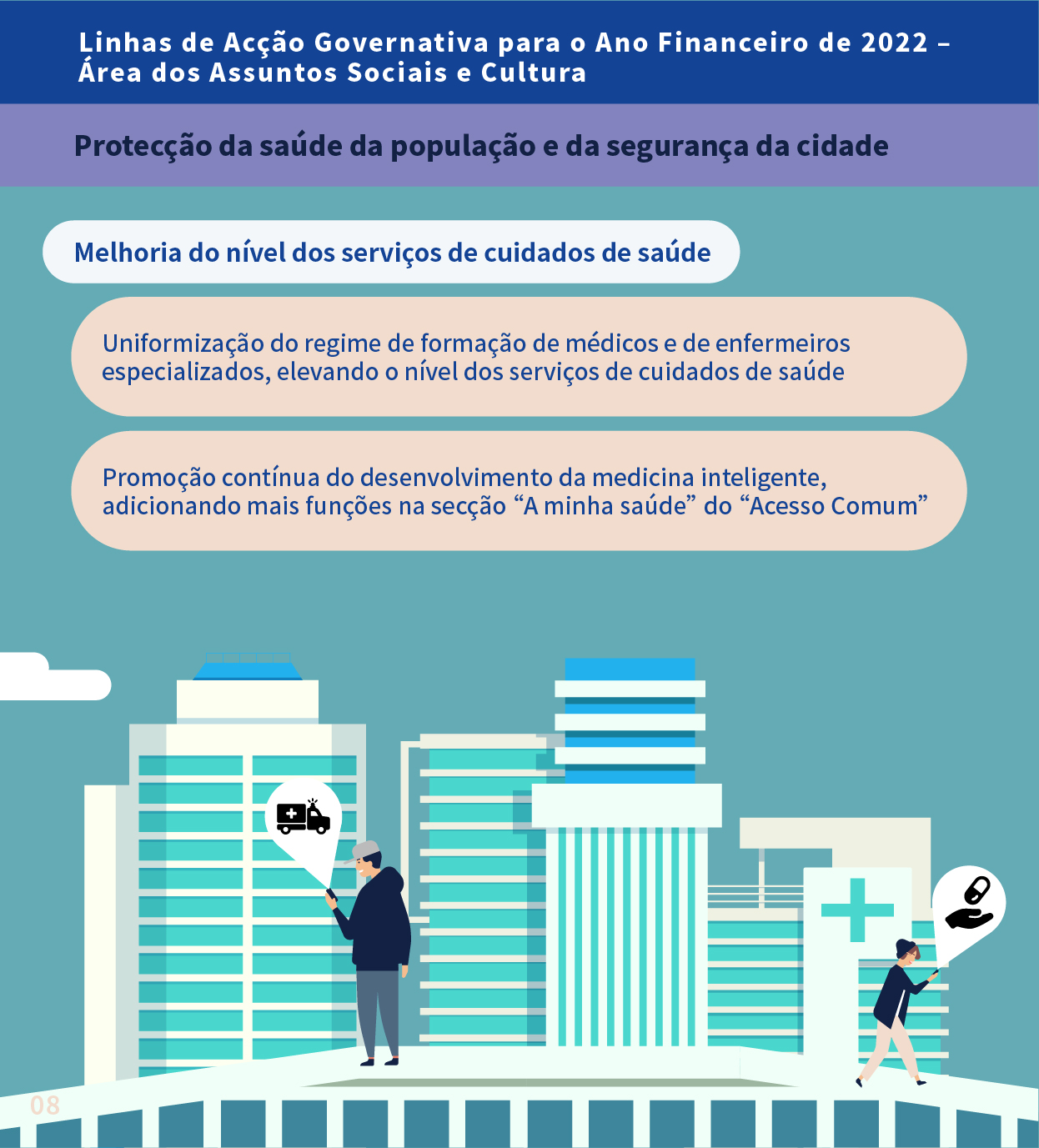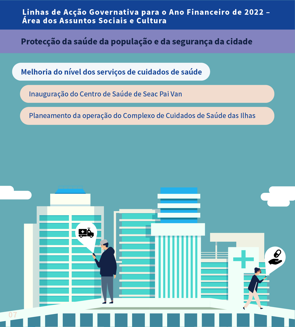 Infografia das Linhas de Acção Governativa para o Ano Financeiro de 2022 na Área dos Assuntos Sociais e Cultura - No domínio da Saúde