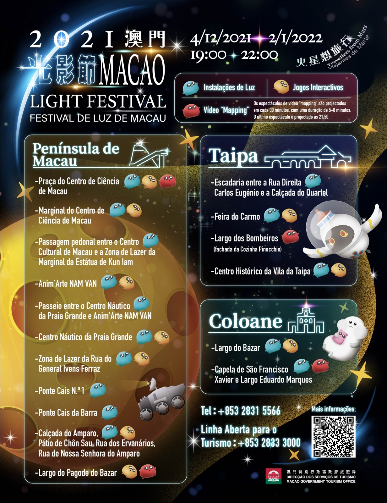 O “Festival de Luz de Macau 2021 - Viajantes de Marte”, organizado pela Direcção dos Serviços de Turismo (DST), tem início este sábado (dia 4). O Festival de Luz de Macau volta a entrar nos bairros comunitários, a ajudar a aprofundar a integração intersectorial de “turismo + cultura e criatividade”, promovendo a economia nocturna e comunitária, e celebrando os feriados festivos com os residentes e visitantes.