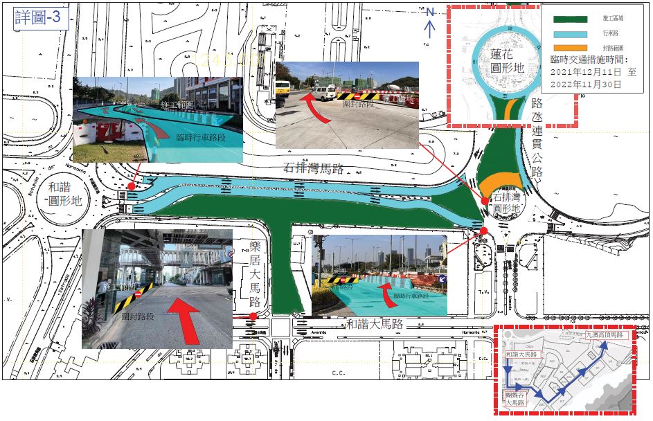 - Durante o período entre os dias 11 de Dezembro de 2021 e 30 de Novembro de 2022, na Entrada de Seac Pai Van entre a Rotunda de Seac Pai Van e a Rotunda da Harmonia, os condutores devem utilizar a nova faixa de rodagem temporária ao pé de Kartódromo de Coloane. Por outro lado, a Rotunda de Seac Pai Van será encerrada parcialmente, e os veículos, da Rotunda da Harmonia para Ká Hó, devem virar da Rotunda da Harmonia para a habitação pública de Seac Pai Van passando pela Avenida de Vale das Borboletas em direcção à Estrada do Altinho de Ká Hó ou passar pela Rotunda Flor de Lótus e virar para a Estrada do Altinho de Ká Hó por meio da Rotunda de Seac Pai Van (vide desenho 3).