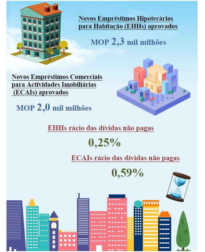 De acordo com as estatísticas publicadas hoje pela AMCM, em Outubro de 2021, os novos empréstimos hipotecários para habitação (EHHs) e os empréstimos comerciais para actividades imobiliárias (ECAIs) aprovados registaram decrescimento em relação ao mês anterior. Registaram-se declínio no saldo bruto dos EHHs e acréscimo nos ECAIs, quando comparado com o mês anterior.