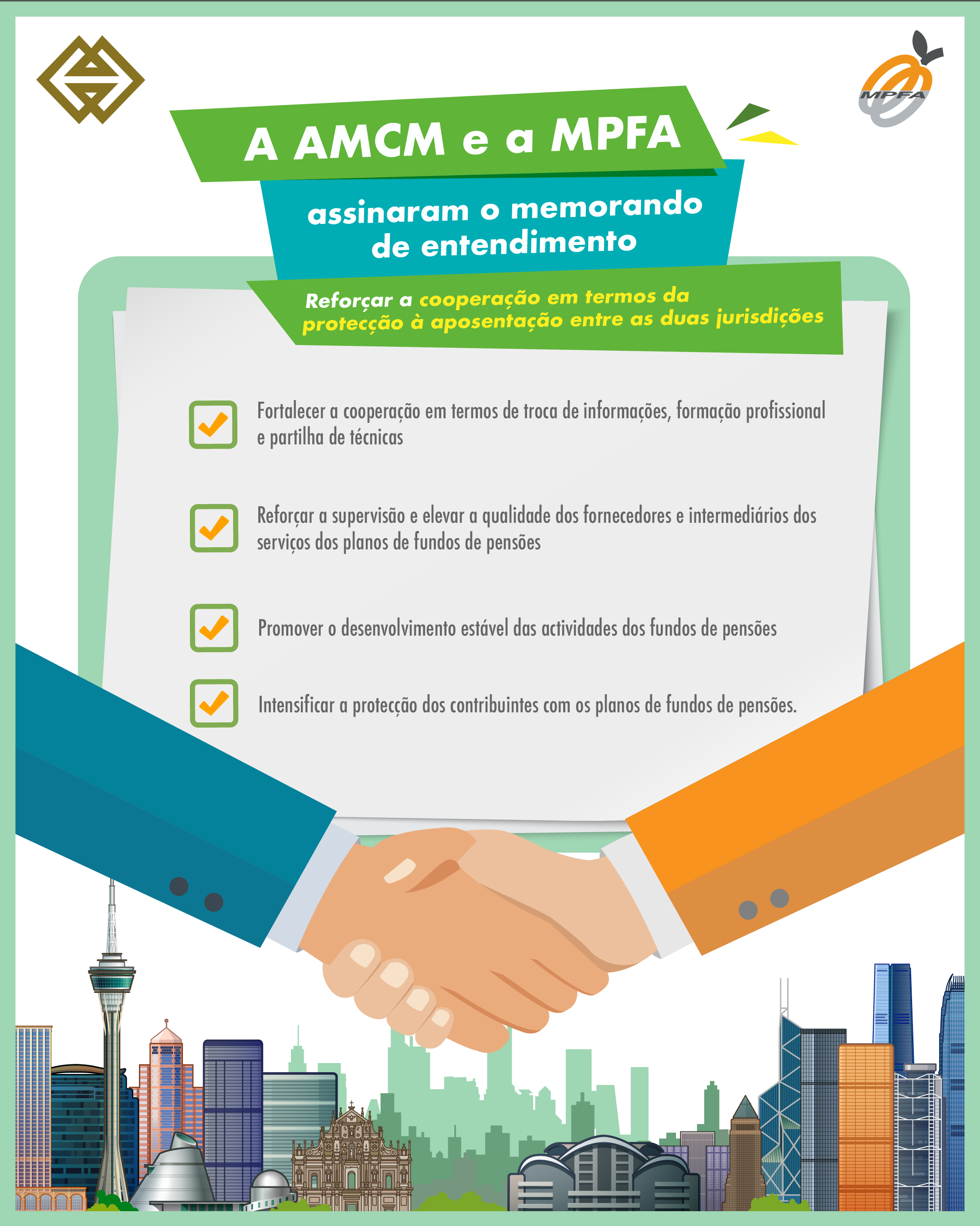 O “Memorando de entendimento sobre a cooperação” foi outorgado conjuntamente pelo Presidente do Conselho de Administração da AMCM, Dr. Chan Sau San, e a Presidente da MPFA, Dra. Ayesha Lau. As duas partes concordam na importância da protecção à aposentação com vista ao desenvolvimento económico e social, pelo que se revela necessário que as autoridades de supervisão de Hong Kong e Macau fortaleçam a cooperação em termos de troca de informações, formação profissional e partilha de técnicas para reforçar a supervisão e elevar a qualidade dos fornecedores e intermediários dos serviços dos planos de fundos de pensões, promovendo o desenvolvimento estável das actividades dos fundos de pensões, intensificando a protecção dos contribuintes com os planos de fundos de pensões.