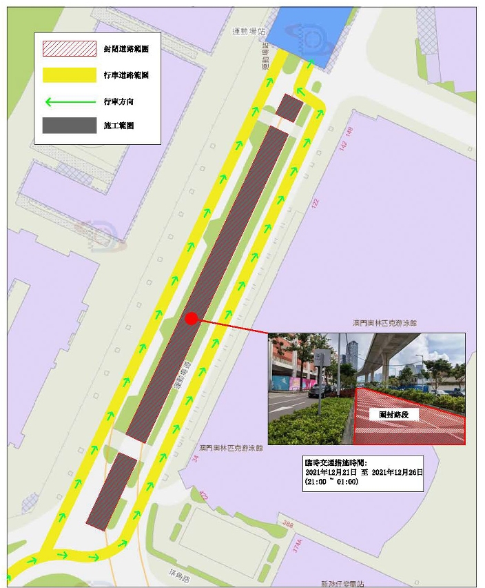- No período entre 21 e 26 de Dezembro de 2021, das 21H00 à 01H00 do dia seguinte, será vedada a via do meio da faixa de rodagem da Rotunda da Piscina Olímpica em direcção à Estação do Estádio, pelo que o trânsito nas vias em direcção ao Centro de Taipa ficará condicionado. (vide planta 1)