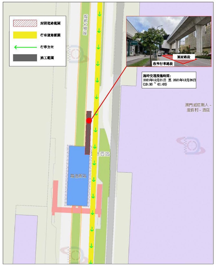 - No período entre 21 e 26 de Dezembro de 2021, das 19H00 à 01H00 do dia seguinte, uma parte da faixa da Avenida Cidade Nova, junto da Estação Cotai Oeste, conforme a necessidade de trabalhos, passará a ser uma via de circulação. (vide planta 2)