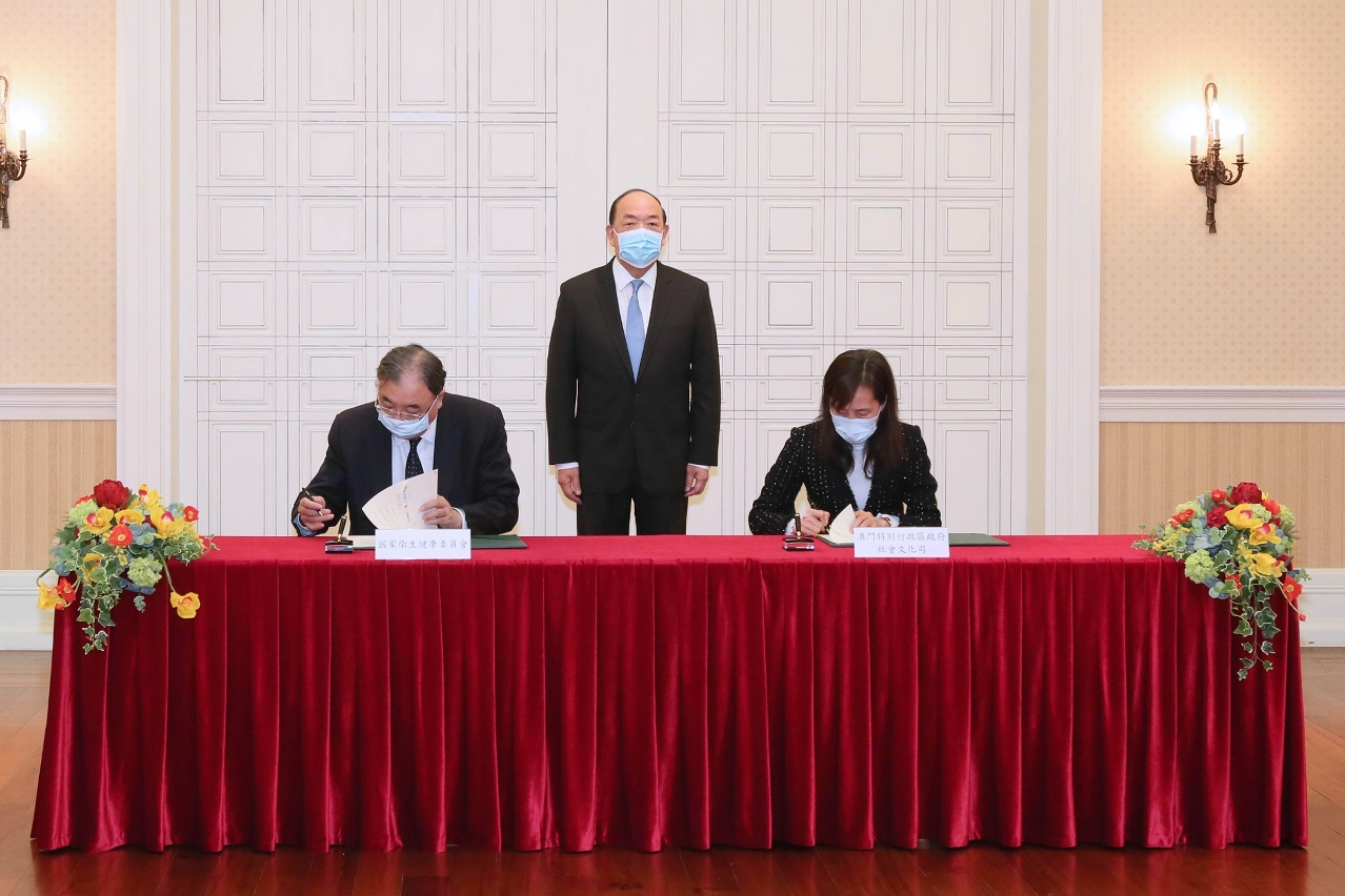 Testemunhado pela Sua Excelência o Chefe do Executivo, Dr. Ho Iat Seng, a celebração do memorando de cooperação no âmbito de cooperação do Complexo de Cuidados de Saúde das Ilhas entre a Exma Senhora Secretária para os Assuntos Sociais e Cultura, Dra. Ao Ieong U e o Director da Comissão Nacional de Saúde, Ma Xiaowei.