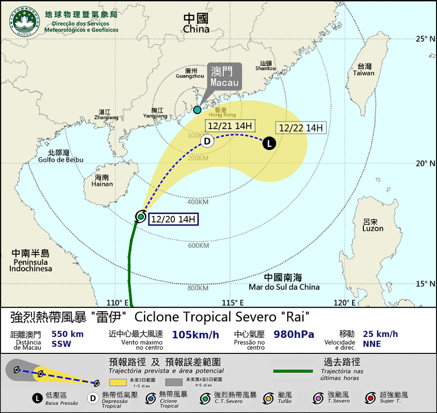 O ciclone tropical “Rai” tomou um rumo para nordeste. Amanhã (21) espera-se que o ciclone tropical cruze o ponto mais junto do território, a cerca de 200 km a sul de Macau. As bandas de chuva associadas vão afectar Macau hoje (20) e amanhã (21). Na altura, podem ocorrer aguaceiros mais frequentes e contínuos na região. O vento pode atingir o nível 6 da Escala de “Beaufort” com rajadas. Embora "Rai" enfraqueça, espera-se que seja o mais próximo de Macau entre a madrugada e o início da manhã do dia 21. Esta Direcção vai considerar a necessidade de emitir o sinal de nº 3 de tempestade tropical durante a noite de hoje. Aconselha-se à população que preste atenção à variação das condições atmosféricas e às informações mais recentes sobre o tufão.