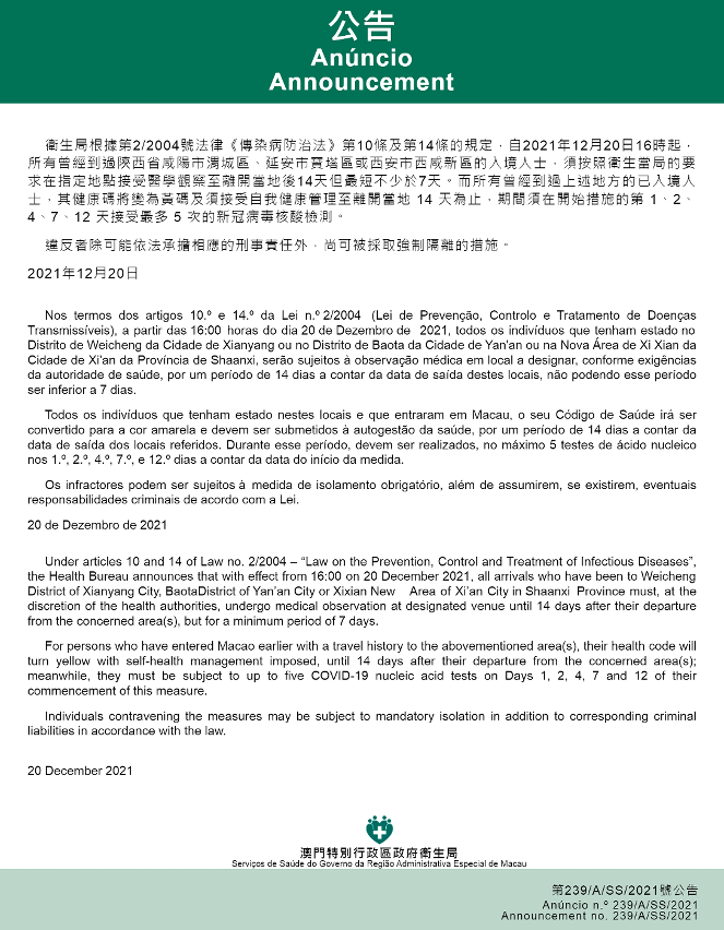 O Centro de Coordenação de Contingência do Novo Tipo de Coronavírus informa que tendo em consideração a evolução epidemiológica mais actualizad na Província de Shaanxi, a partir da 16h00 do dia 20 de Dezembro de 2021, todos os indivíduos que tenham estado no Distrito de Weicheng da Cidade de Xianyang ou no Distrito de Baota da Cidade de Yan'an ou na Nova Área de Xi Xian da Cidade de Xi'an da Província de Shaanxi, serão sujeitos à observação médica em local a designar, conforme exigências da autoridade de saúde, por um período de 14 dias a contar da data de saída destes locais, não podendo esse período ser inferior a 7 dias.