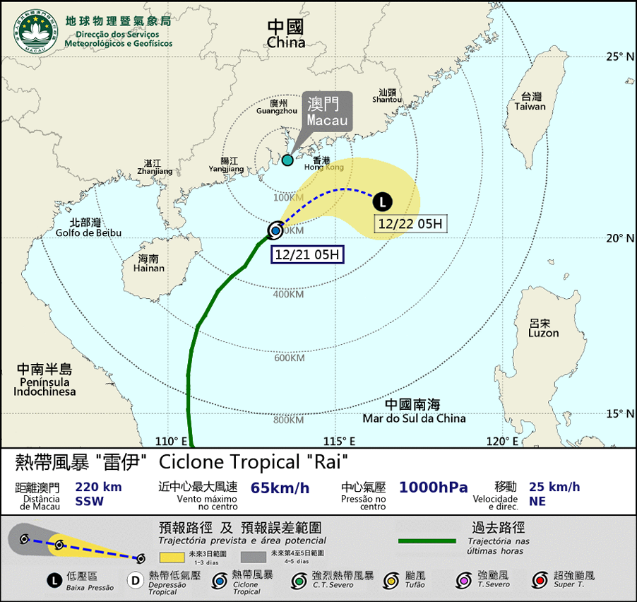 O ciclone tropical “Rai” vai passar a cerca de 200 km a sul de Macau na manhã do dia 21. Sob a influência das fitas pluviais de “Rai”, a chuva começou a ser mais intensa na manhã do dia 21. Apesar de “Rai” ter sido o mais próximo de Macau durante a manhã, prevê-se que a intensidade tenha diminuído mais rapidamente, a não ser que o “Rai” adopte o caminho mais norte, caso contrário, a possibilidade de substituição do sinal n.º 3 será menor. Aconselha-se à população que preste atenção à variação das condições atmosféricas e às informações mais recentes sobre o tufão.