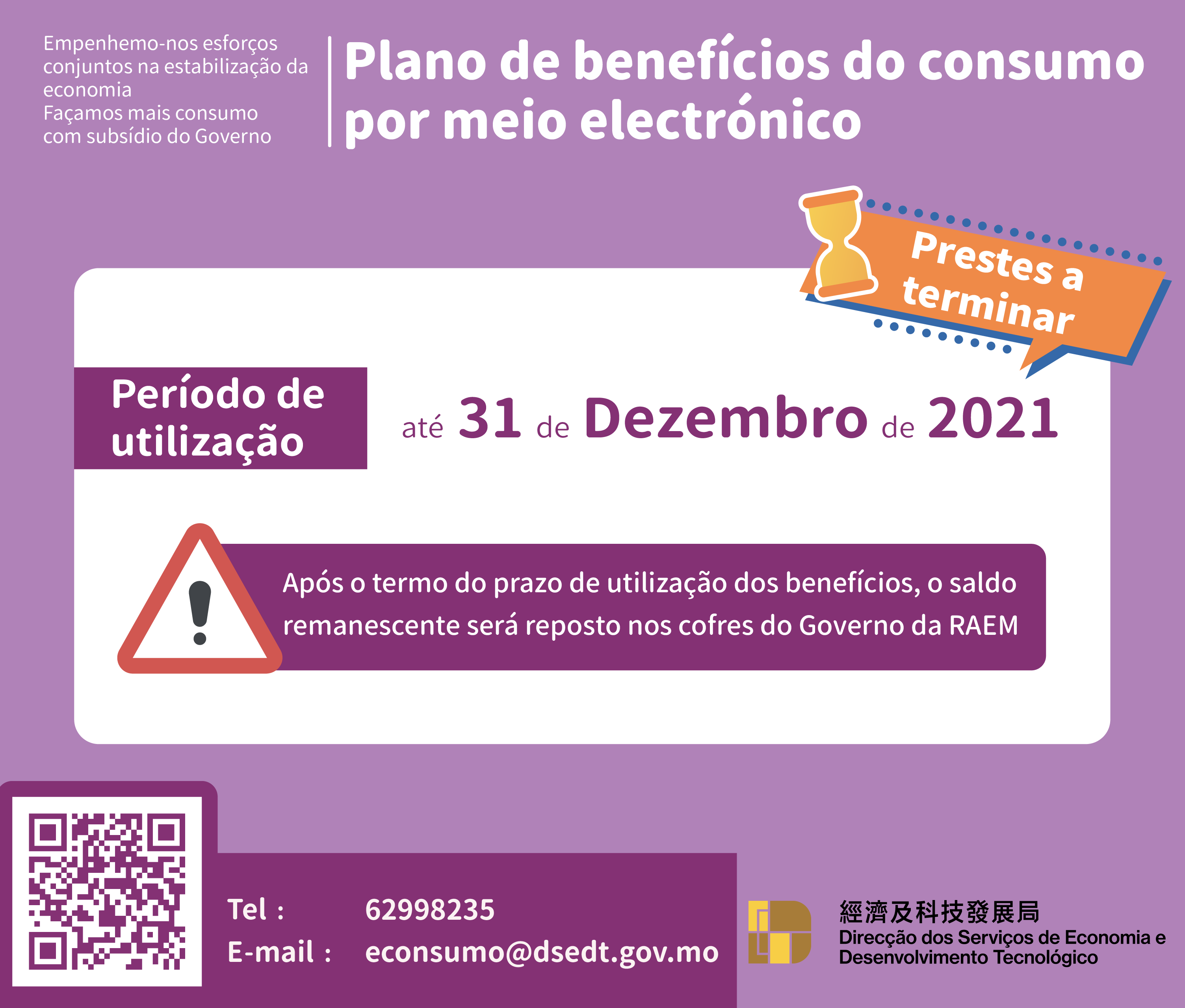Para esclarecimento de dúvidas acerca do “Plano de benefícios de consumo por meio electrónico”, por favor consulte a página exclusiva deste Plano (www.dsedt.gov.mo/econsumo), ou solicite informações junto da DSEDT, durante o horário de expediente, através dos seguintes meios: