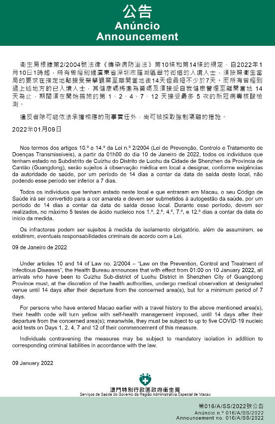 O Centro de Coordenação de Contingência do Novo Tipo de Coronavírus informa que tendo em consideração a evolução epidemiológica mais actualizada na Província de Cantão (Guangdong), a partir da 01h00 do dia 10 de Janeiro de 2022, todos os indivíduos que tenham estado no Subdistrito de Cuizhu do Distrito de Luohu da Cidade de Shenzhen da Província de Cantão (Guangdong), serão sujeitos à observação médica em local a designar, conforme exigências da autoridade de saúde, por um período de 14 dias a contar da data de saída deste local, não podendo esse período ser inferior a 7 dias.